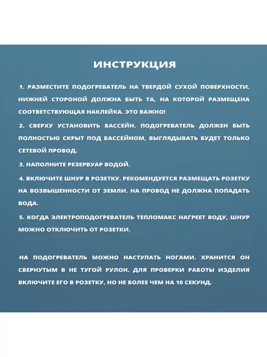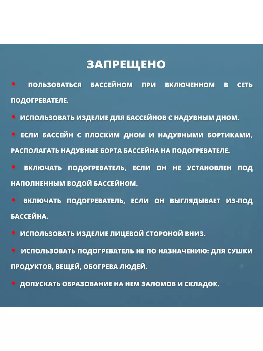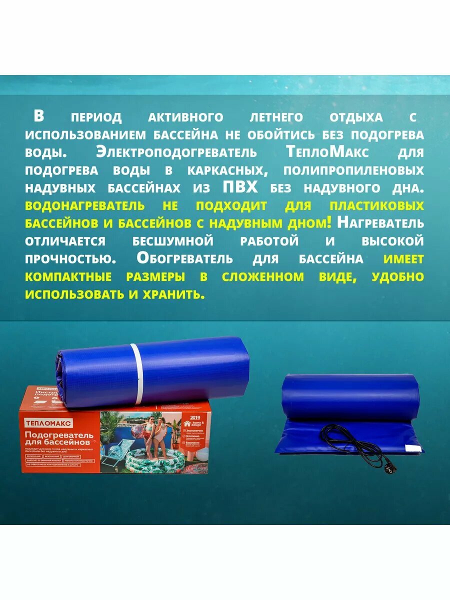 | Дополнительная информация | температура при кратковременном включении в сеть без установки под бассейн до 90C, рабочая температура при установке под бассейном с водой 40-45С; длина сетевого шнура 2,2 м |