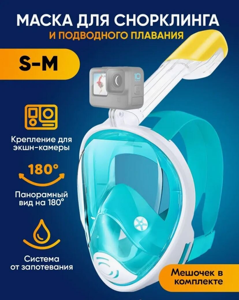 Маска полнолицевая для плавания, снорклинга с креплением для экшн-камеры зелёная L/XL