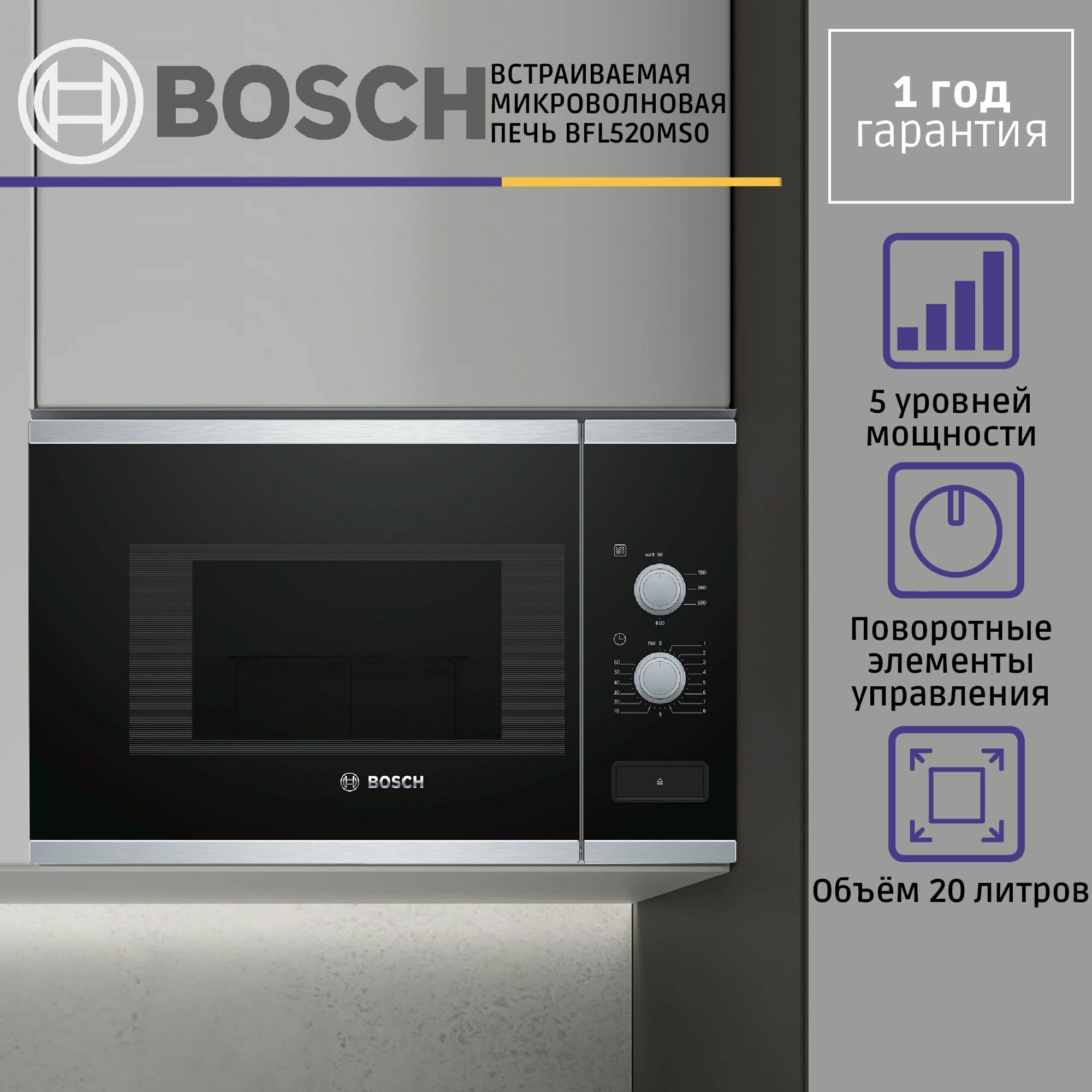 Микроволновая печь Bosch BFL520MS0, встраиваемая, 20л, 800Вт, черный