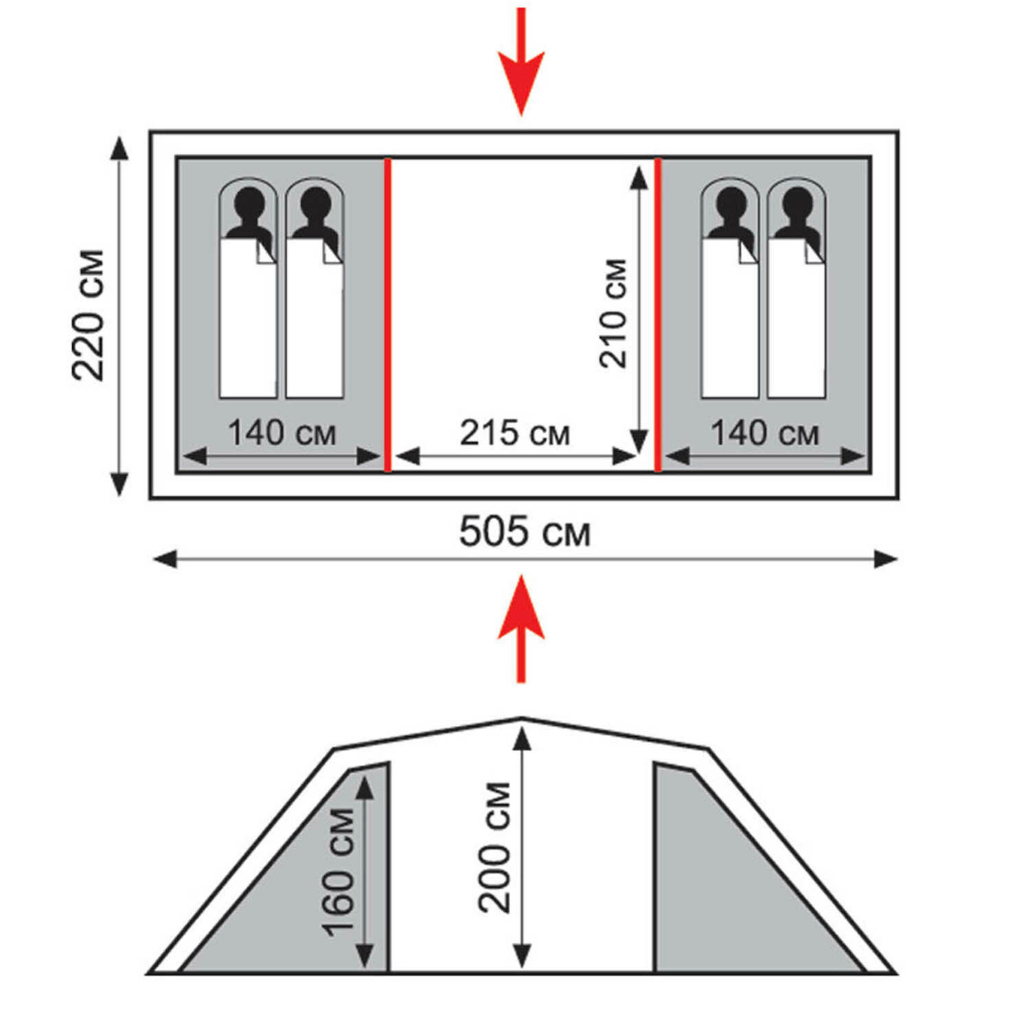 | Габариты внешней палатки(ДxШxВ) | 585x220x210 cм |