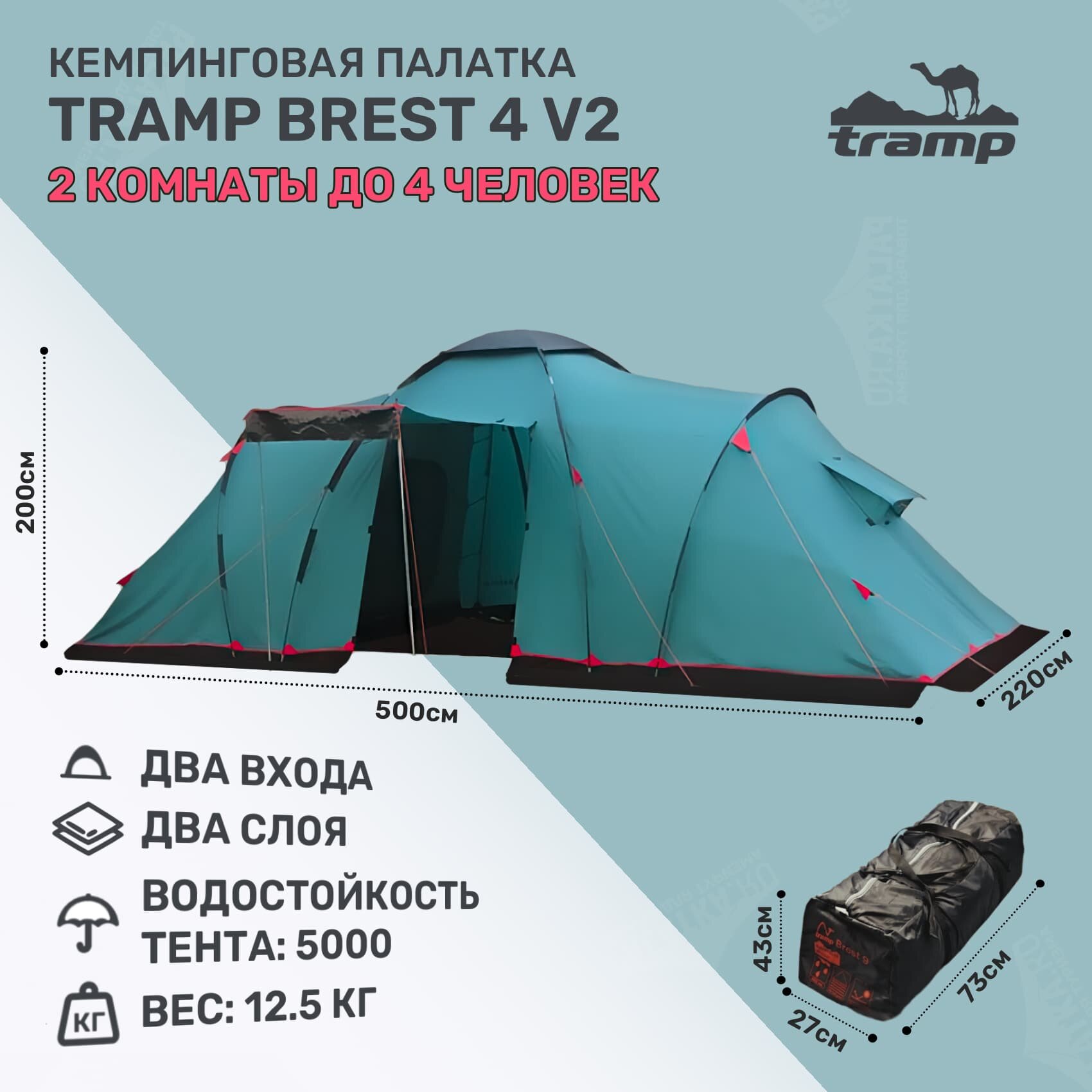 Палатка Tramp "Brest 4 V2", кемпинговая, 4-местная, внутренний каркас, двухслойная, 5000/10000 мм, 13.5 кг, зеленая