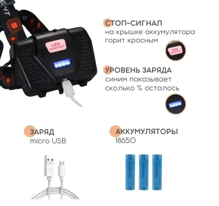 | Дополнительная информация | 5 режимов: яркий, средний, экo, синий свет, стробоскоп; подробная комплектация: Фонарь налобный, Аккумуляторные батарейки 2шт, Usb кабель для зарядки, Коробка.; количество батарей: 2; количество режимов работы: 5; потребление питания: micro-USB, от бортовой сети автомобиля, от USB |