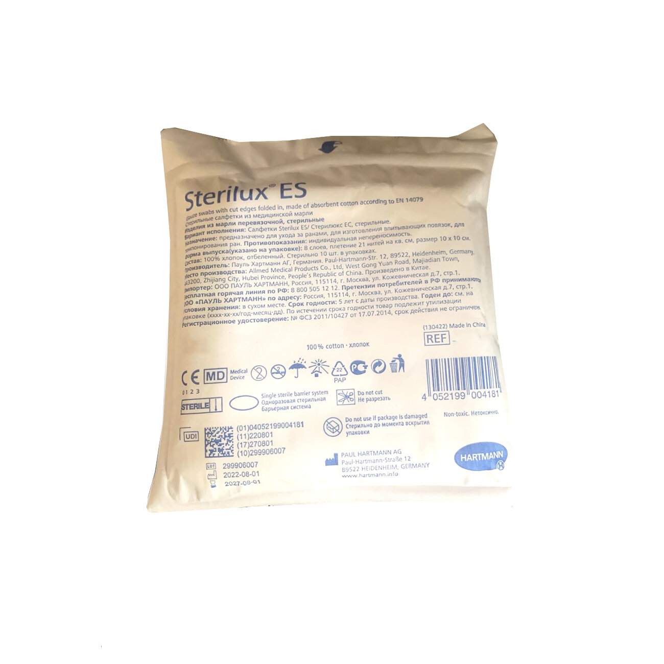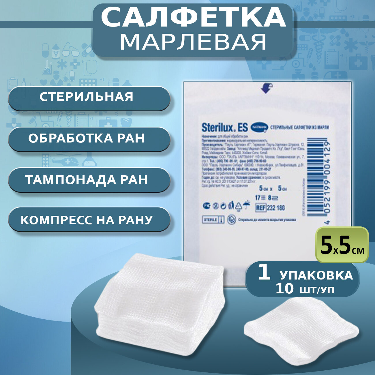 Hartmann Sterilux ES, салфетки стерильные марл. 7,5 х 7,5 см, 10 шт.