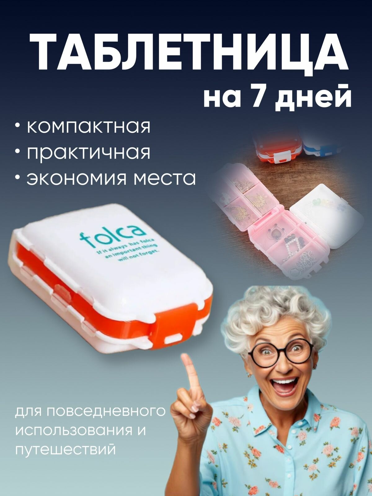 Таблетница карманная Folca утро/день/вечер/ночь белая с оранжевым интересное: