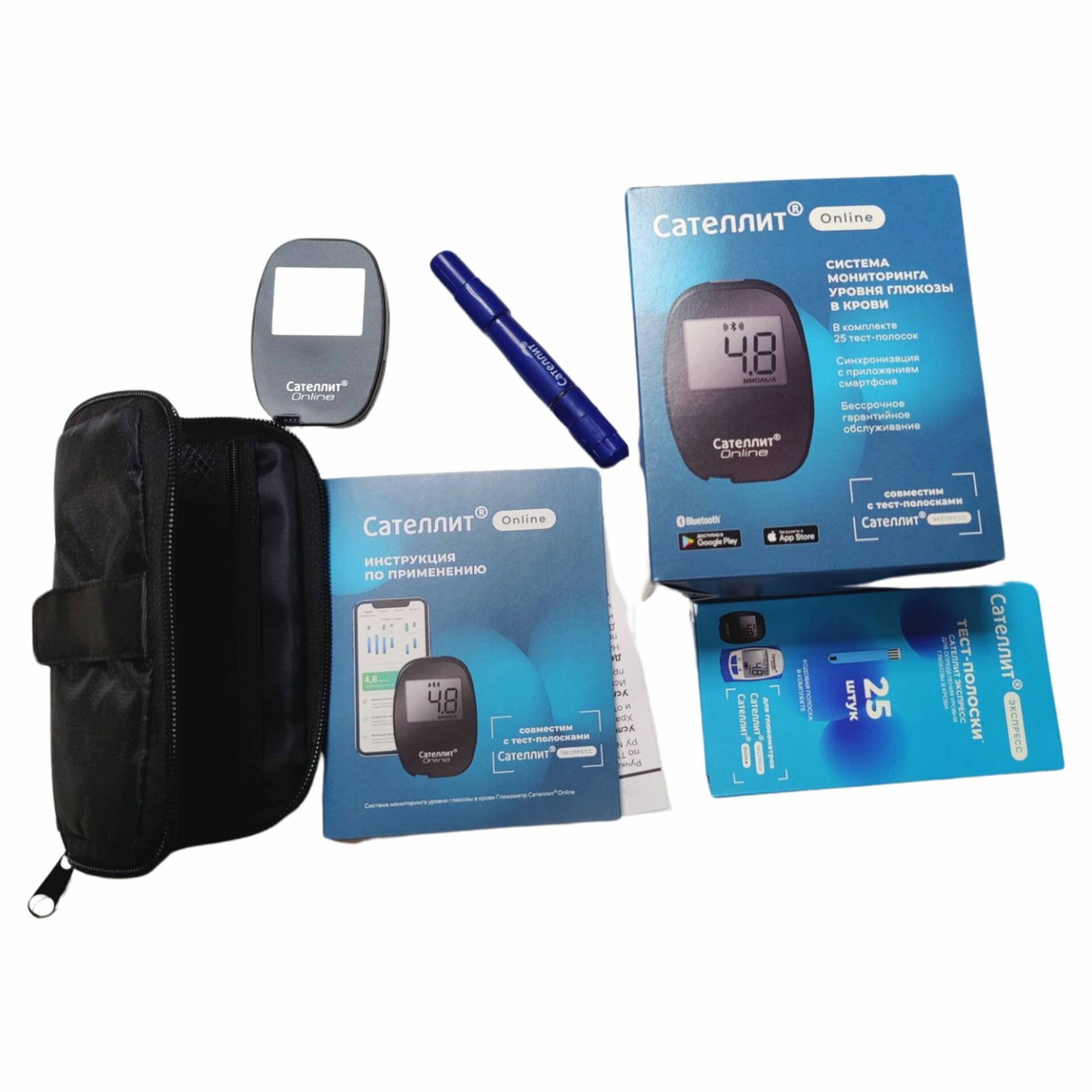 | Комплектация | Глюкометр Сателлит Online Тест-полоски Сателлит Экспресс (25 шт.) Батарейка (элемент питания) Мягкий футляр для прибора Ручка для прокалывания автоматическая Сателлит Полоска Контроль Гарантийный талон Инструкция по эксплуатации |