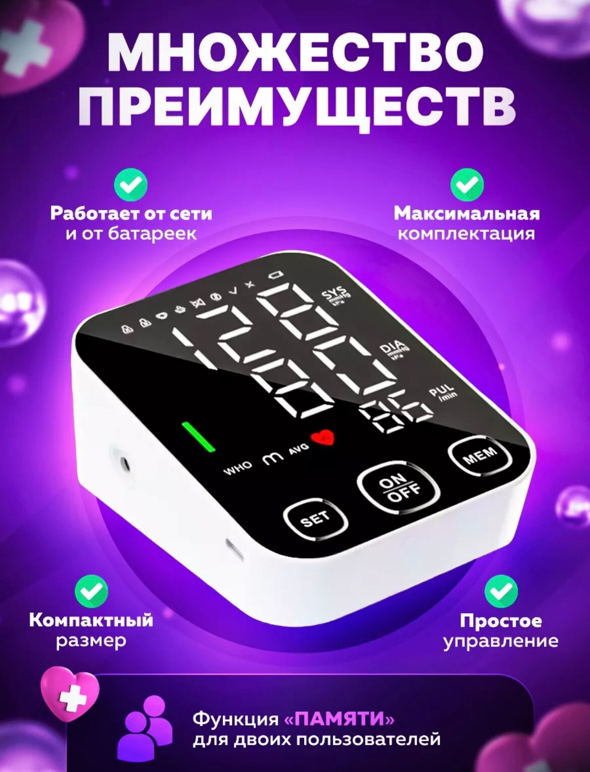 | Особенности | автоматическое отключение / подсветка экрана / фиксация даты и времени / шкала ВОЗ |