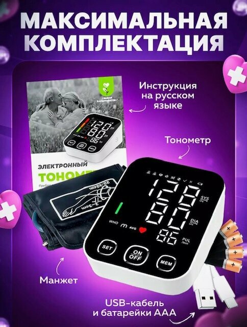 | Комплектация | Манжет для измерения артериального давления; Инструкция на русском языке; Тонометр автоматический; Батарейки ААА-4 шт.; Провод Type-C |