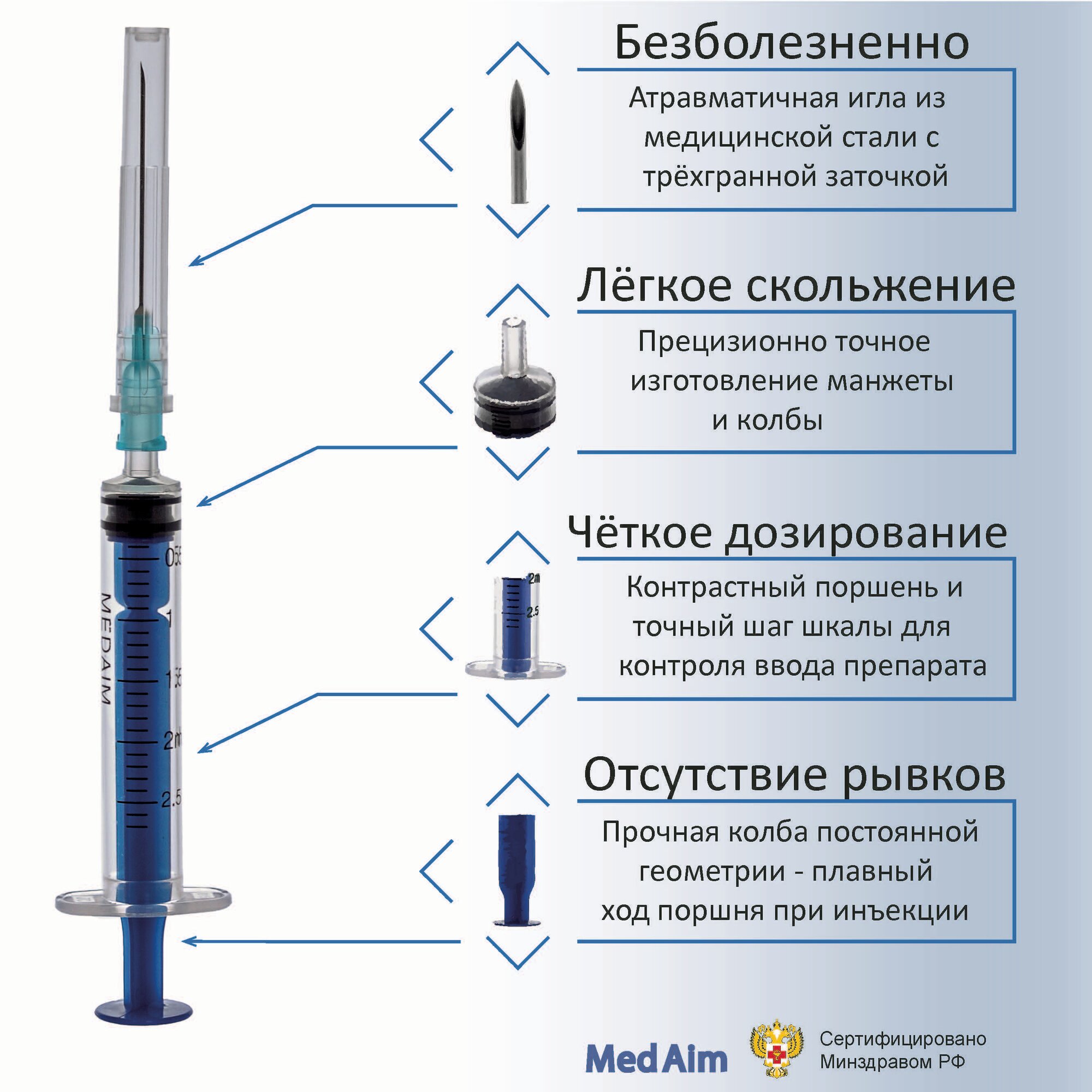 MedAim Шприц инъекц. 20 мл 3-х комп. с иглой 0,8*40 мм (21G*1 1/2") без латекса
