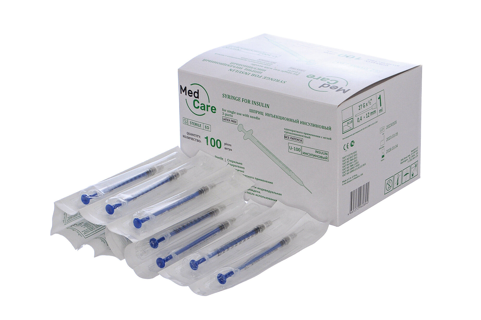 Купить Шприц инсулиновый 1 мл 100 шт/уп. U-100 размер 27G (игла 0,4 х 12 мм)