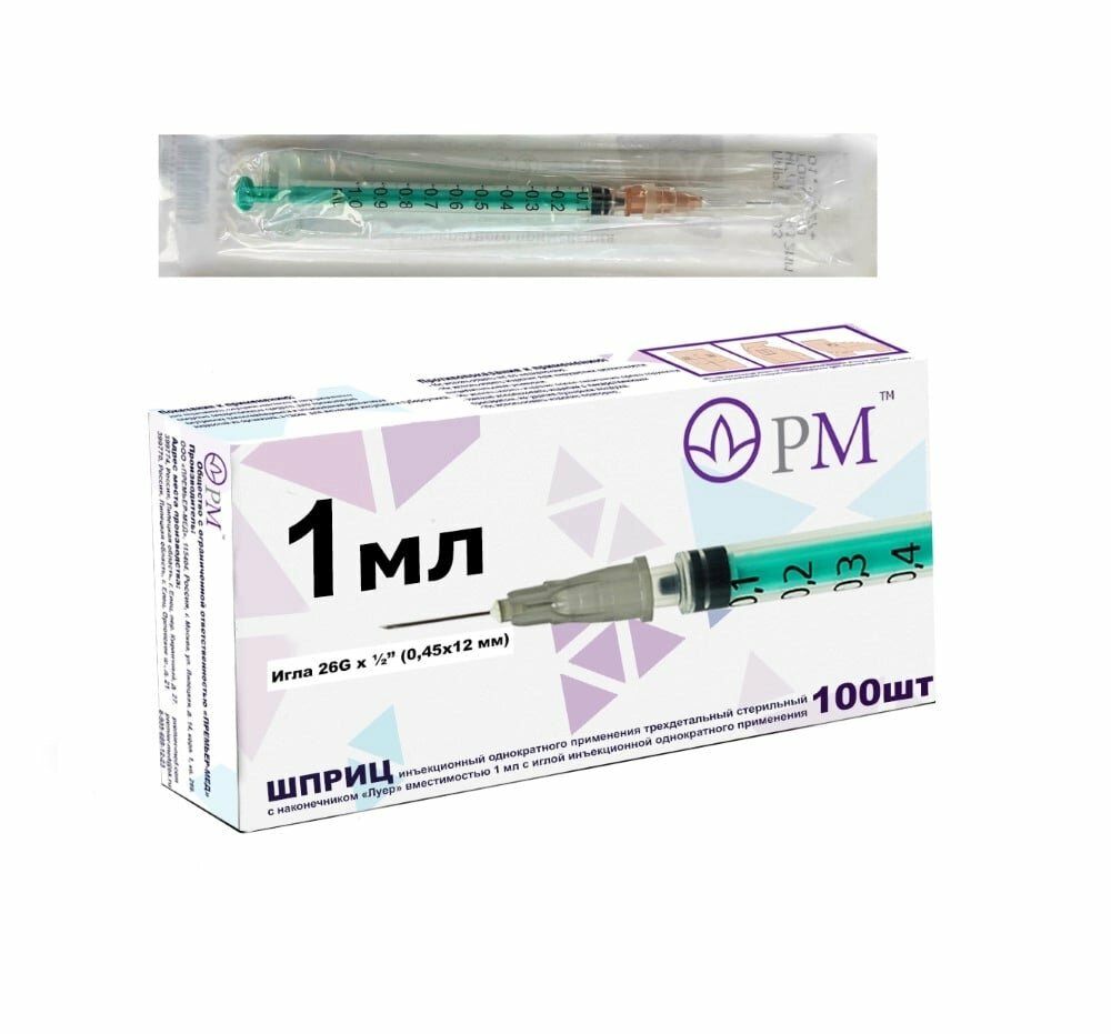 Шприц инсулиновый 1 мл 100 шт/уп. U-100 размер 26G (игла 0,45 х 12 мм)