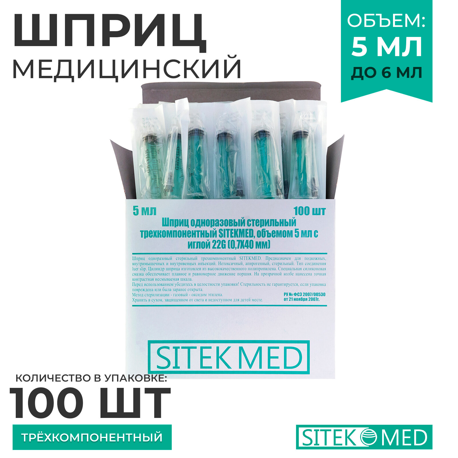Шприц медицинский 5 мл SITEKMED (100 шт.) + игла 22G 1/2 (0,7 х 40мм) одноразовый, стерильный, трехкомпонетный интересное:
