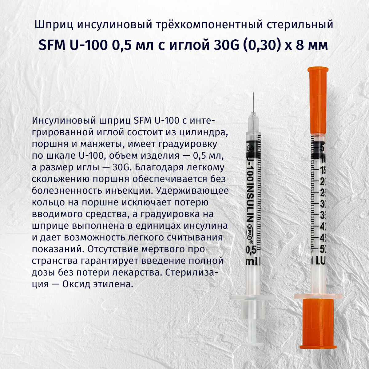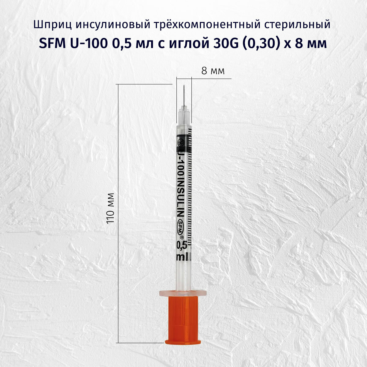 Шприц инсулиновый 0,5 мл со шкалой U-100 с интегрированной иглой 0,30х8 (30G) SFM 100 шт.