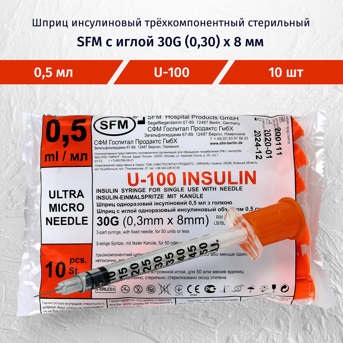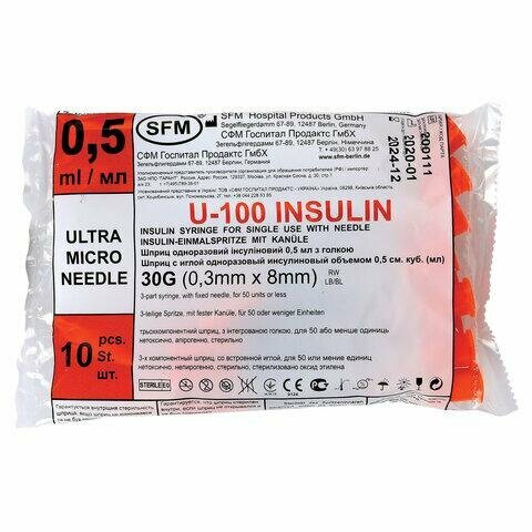 Шприц с иглой одноразовый инсулиновый U-100 30G SFM 0,5мл 0,3мм x 8мм 10шт