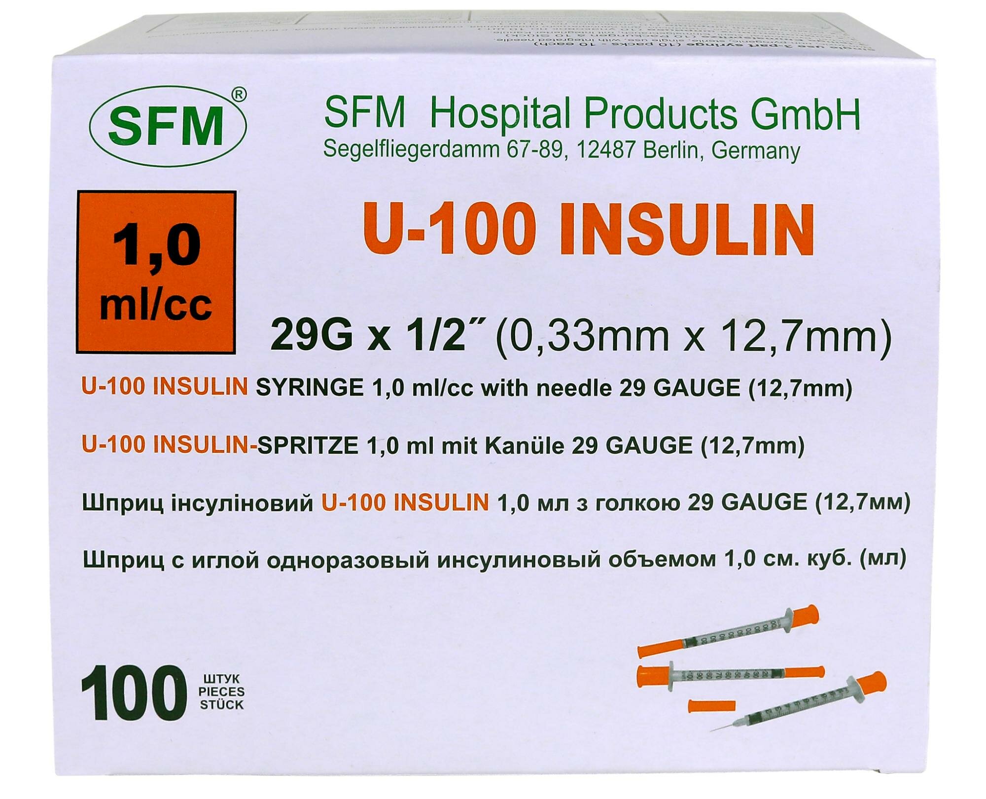 Шприц инсулиновый трехкомпонентный со встроенной иглой 1.0 мл, U - 100, 0,33 мм х 12,7 мм - 29G SFM, Германия, 100 штук