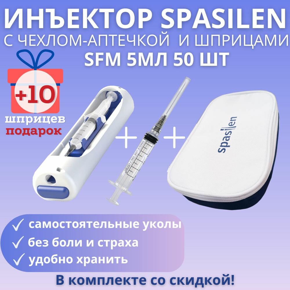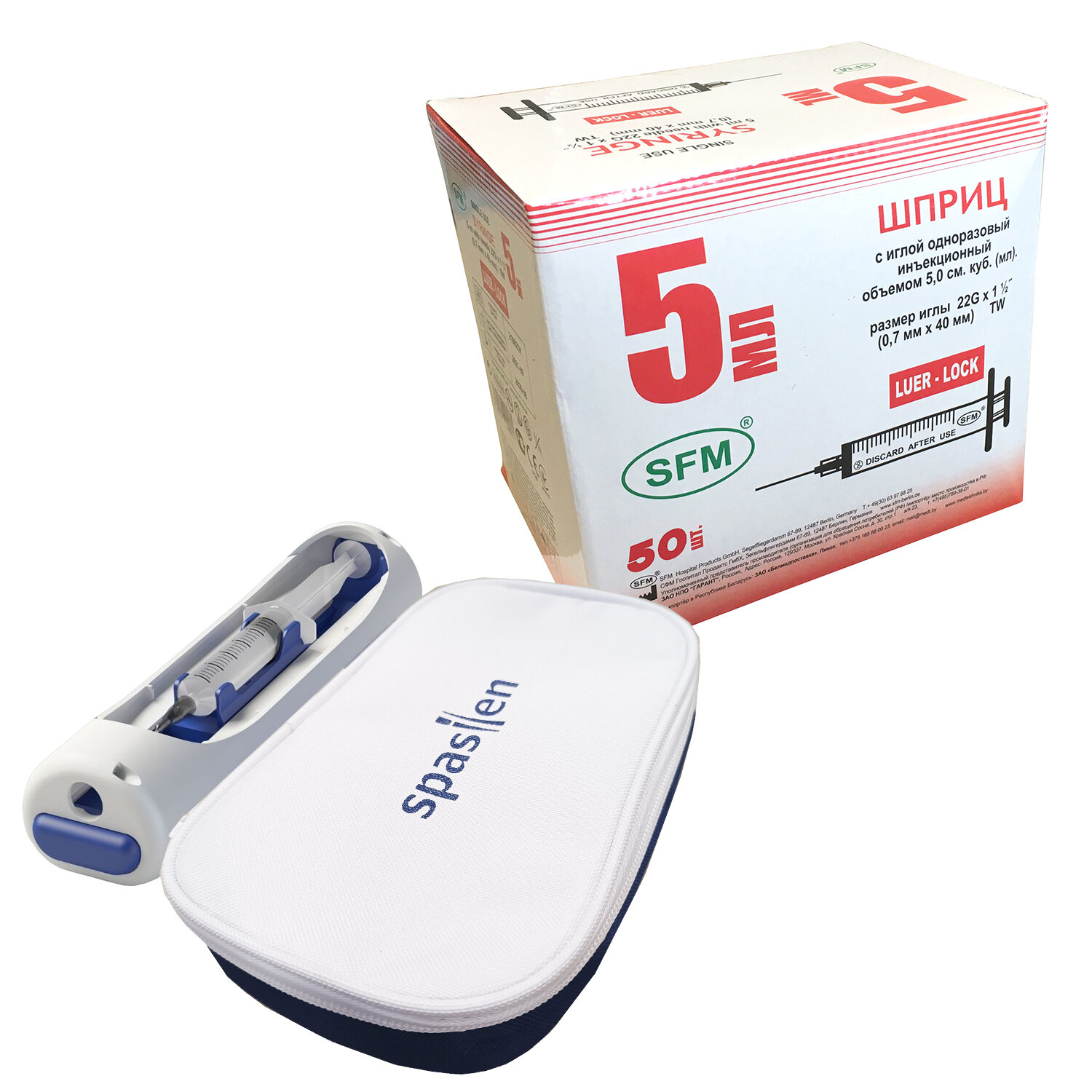 Автоматический инъектор Spasilen с чехлом органайзером + Шприц медицинский 5мл комплект 50 шт SFM Luer Lock (3-х компонентный), игла 0,7 x 40 - 22G интересное: