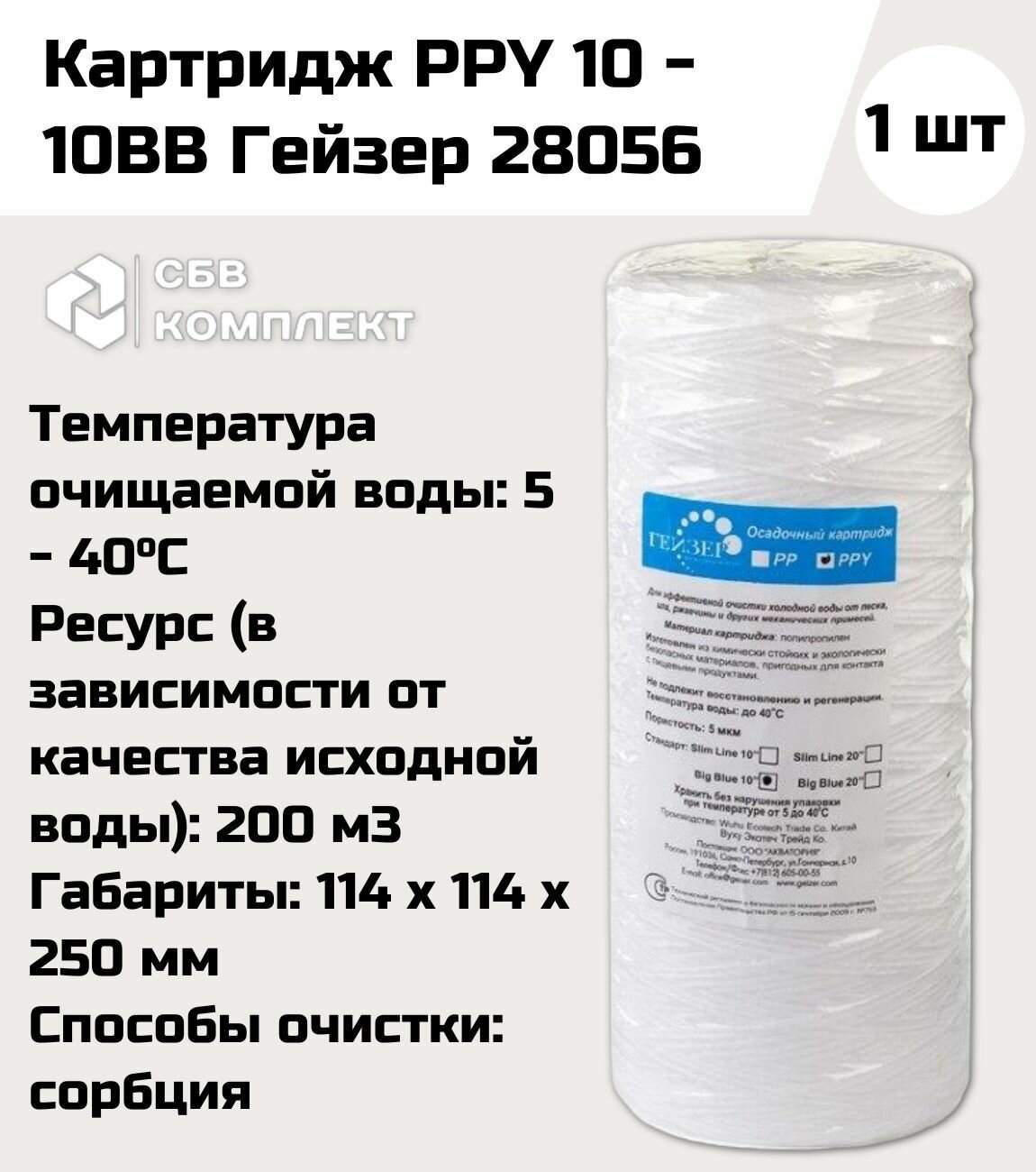 Картридж для очистки холодной воды Гейзер PPY 10-10BB, Big Blue 10"