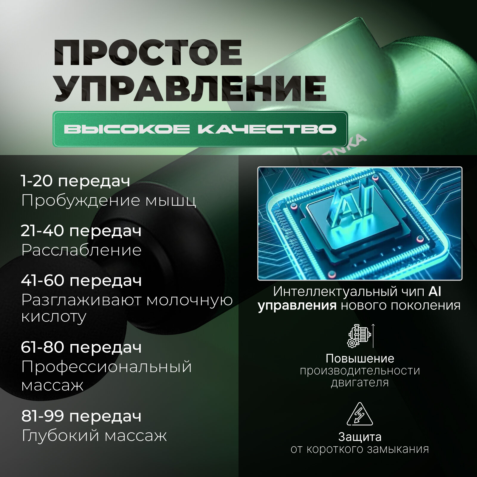 Массажер для тела перкуссионный KONKA 8810 электрический, вибрационный, 8 насадок, беспроводной, зеленый интересное: