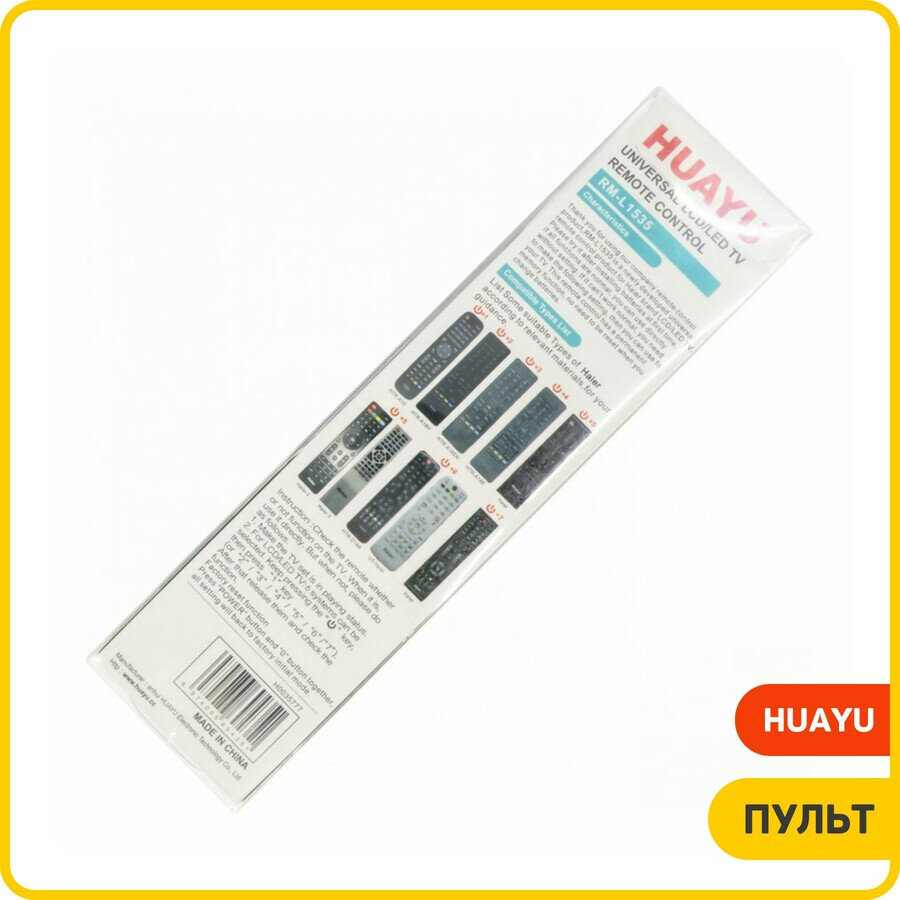 | Дополнительная информация | Универсальный пульт Huayu RM-L1535 для телевизоров Haier. Пульт превосходного качества, он легко настраивается нажатием пары кнопок. Инструкция на русском языке и список поддерживаемых пультов в комплекте. Список моделей заменяемых пультов: HTR-A10 HTR-A18H HTR-A18EN HTR-A18E HTR-D18A И другие пульты Haier, полный список моделей с изображениями пультов указан на упаковке. |