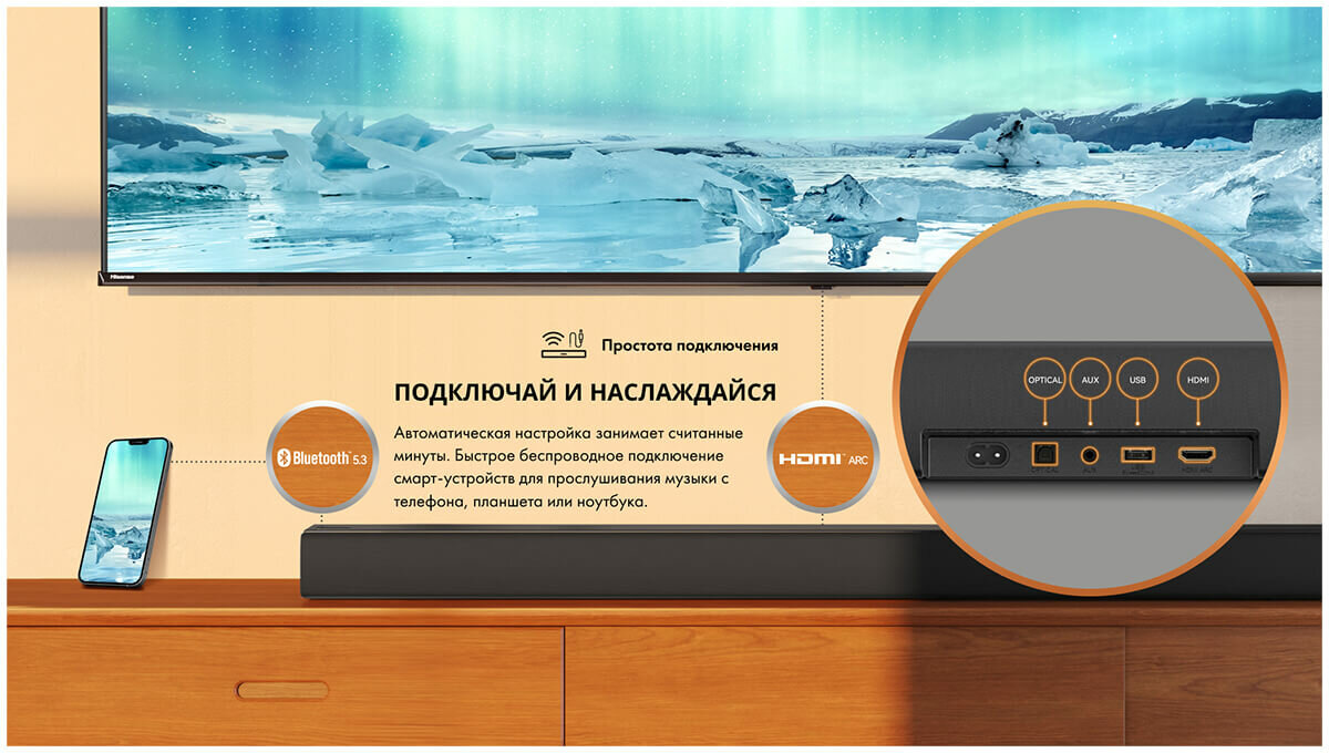 Саундбар для телевизора Hisense HS5100; мощность 540 Вт; беспроводной сабвуфер; тыловые колонки в комплекте; аудиосистема 5.1; поддержка Bluetooth
