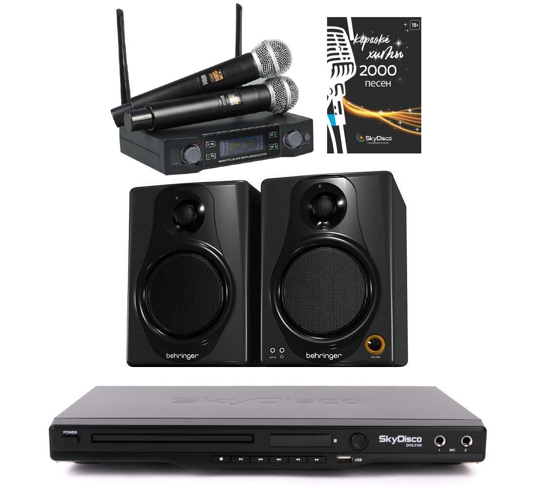 Караоке с акустикой и микрофонами SkyDisco Karaoke Home Set Music Pro: приставка с баллами, микрофоны, колонки 2.0, диск 2000 песен интересное: