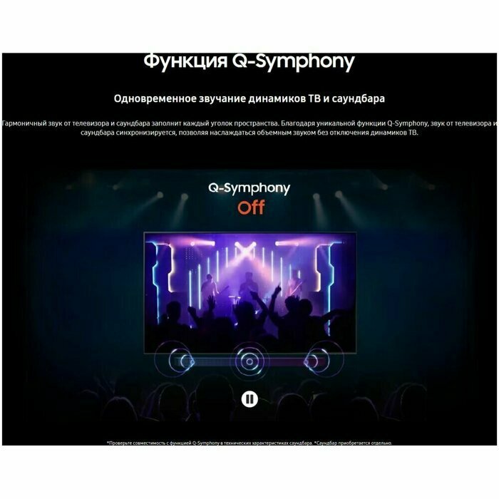 | Дополнительная информация | процессор Crystal 4K тип затемнения UHD Dimming; игровой режим ALLM; поддержка Wireless DeX; ОС Tizen 6.0; Q-Symphony; Tap View; Auto Motion Plus, Motion Xcelerator; режим кино; режим интерьер; поддержка SmartThings; поддержка приложения «Интернет вещей»; галерея; звук ТВ в мобильное устройство; |
