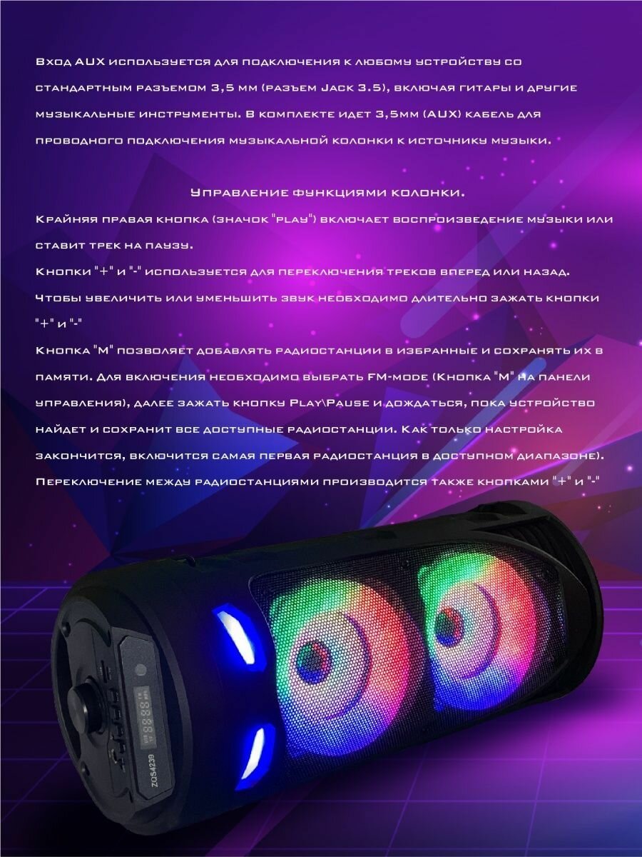 | Особенности | FM-радио / поддержка microSD / ручка / световые эффекты |