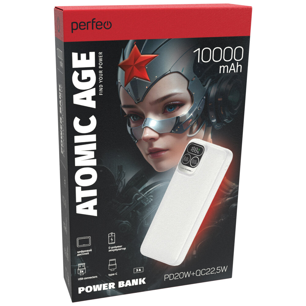 Аккумулятор внешний 10000 mAh Perfeo Powerbank Atomic Age LED/PD + QC 3.0/Type-C/2 USB/Выход: 5A, White