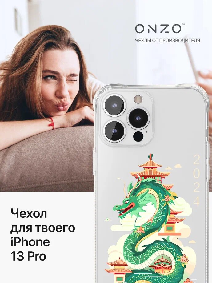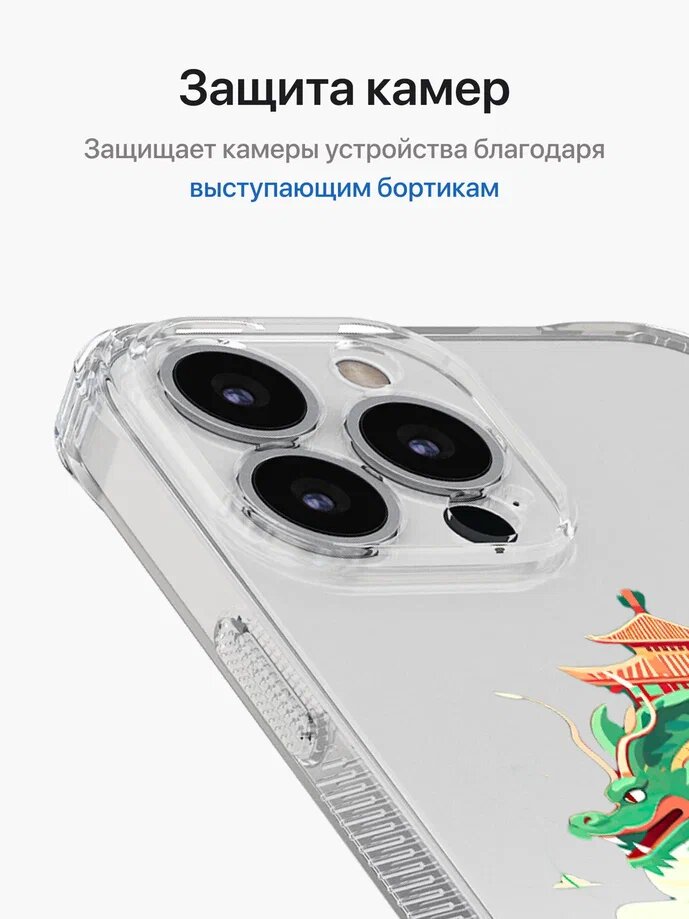 СохранитьПротивоударный чехол на Айфон 13 Про / iPhone 13 Pro прозрачный с принтом "Dragon with temple" интересное: