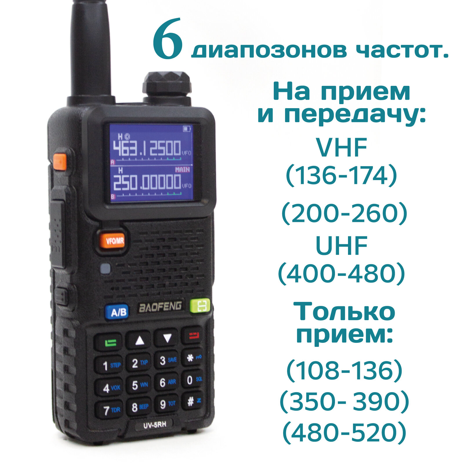 | Диапазон частот | FRS, GMRS, LB, LPD, PMR, UHF, VHF, авиационный диапазон, морской диапазон |