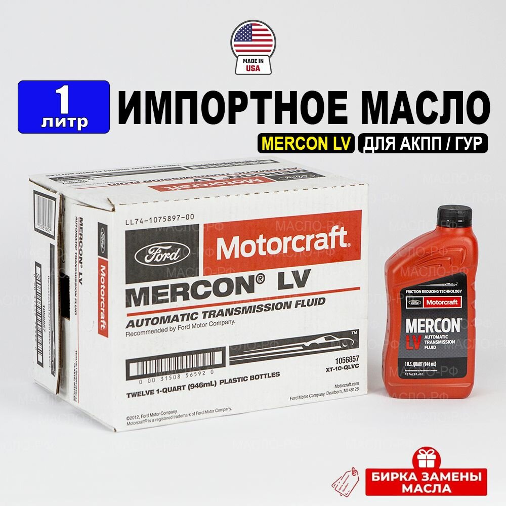 Масло трансмиссионное Ford MERCON LV (США) Motorcraft ATF, (1л) + перчатки, масло АТФ синтетическое для коробки передач Моторкрафт Меркон Форд XT10QLV1, РТЛ