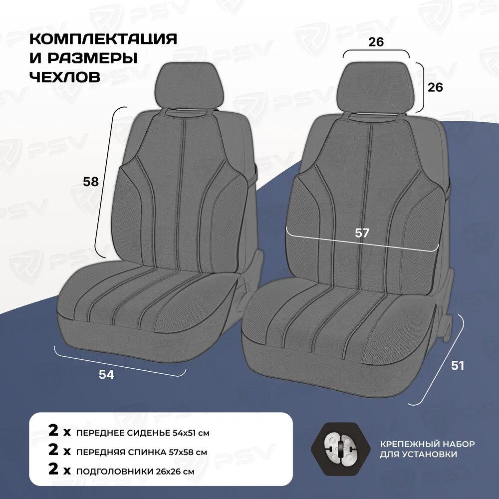 | Подробная комплектация | - 2 передних чехла - 2 стандартных подголовника для передних сидений - Крепежный набор для установки |