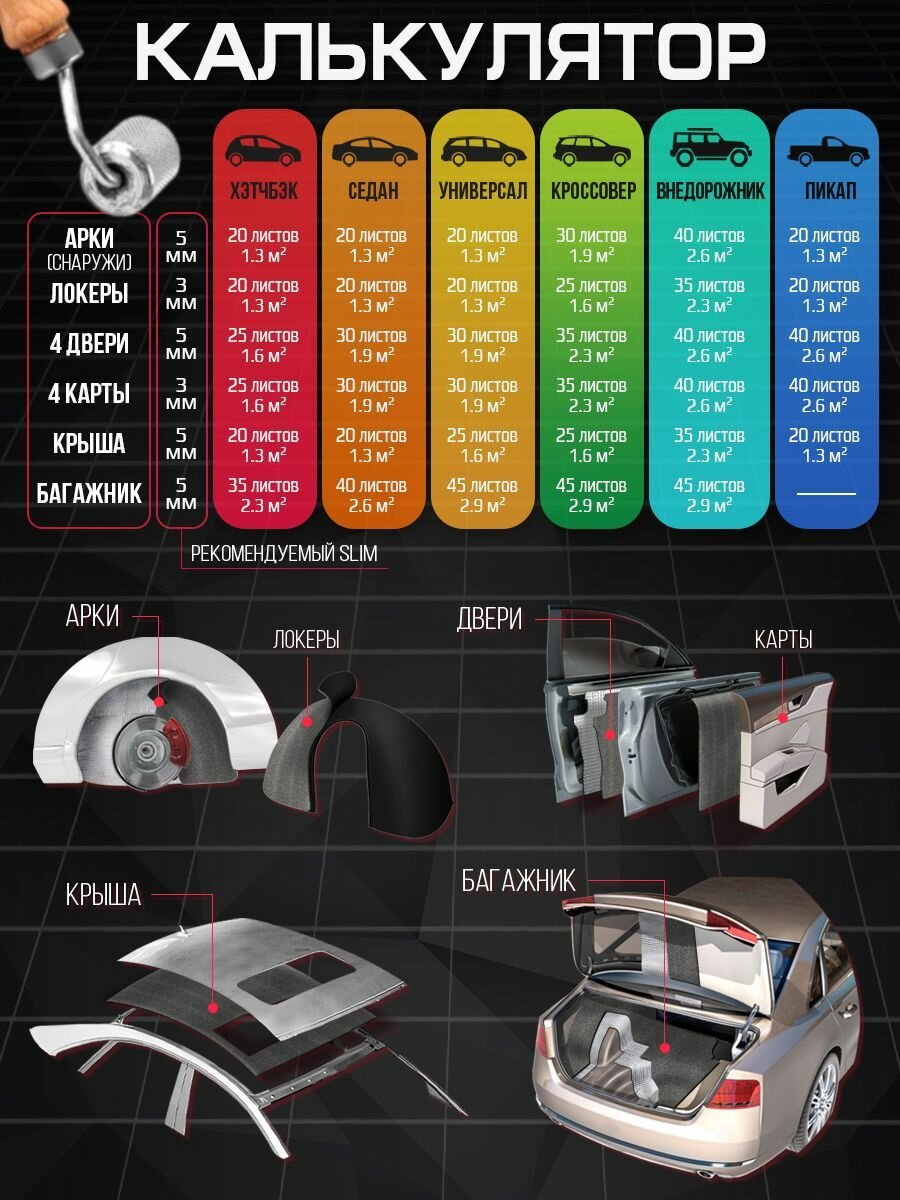 | Место применения | для арок / для багажника / для дверей / для зазоров / для капота / для пола / для потолка / для приборной панели / теплоизоляция / шумоизоляция |