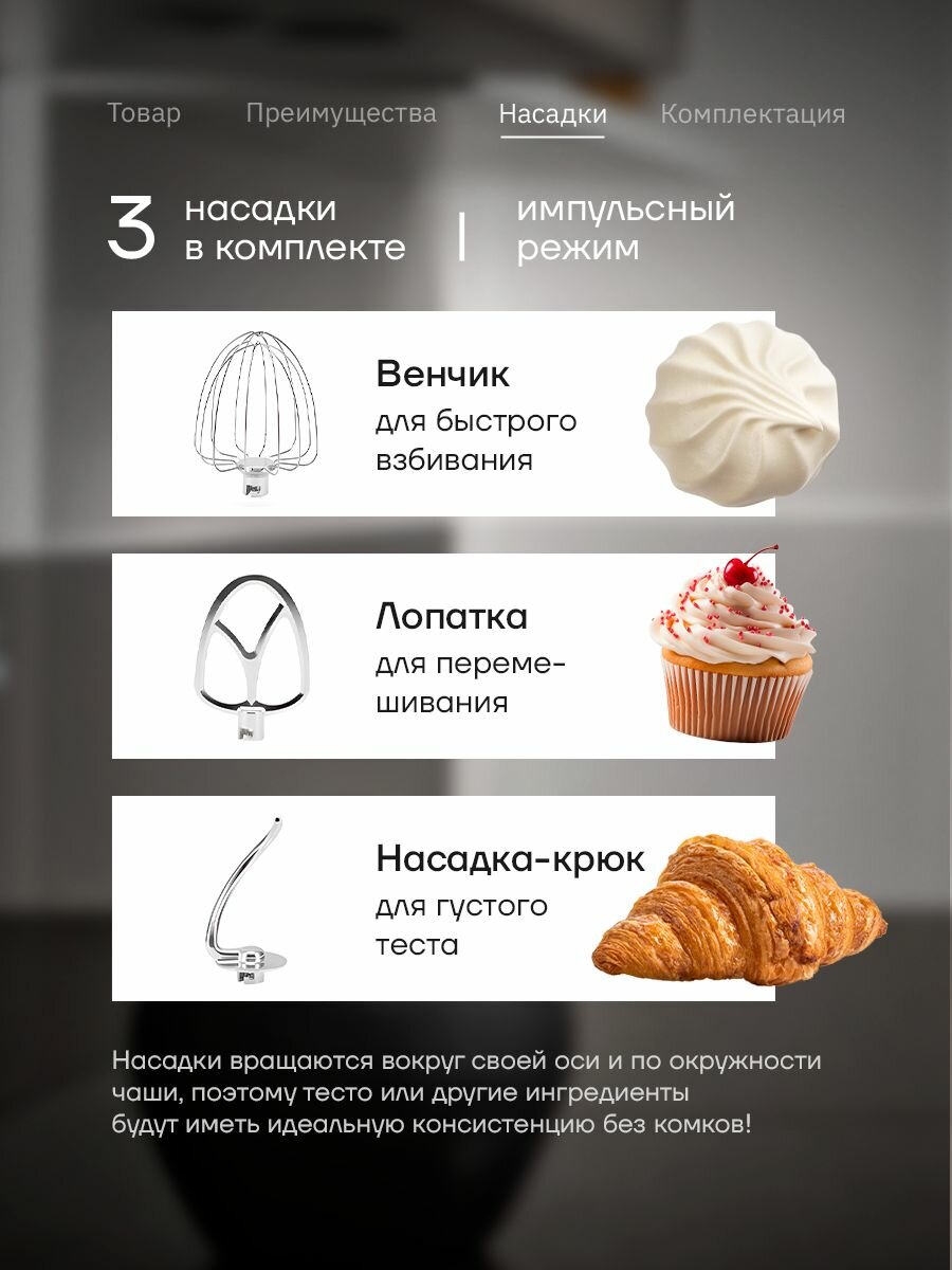 | Насадки | венчик для взбивания / крючки для замешивания теста / лопатка |