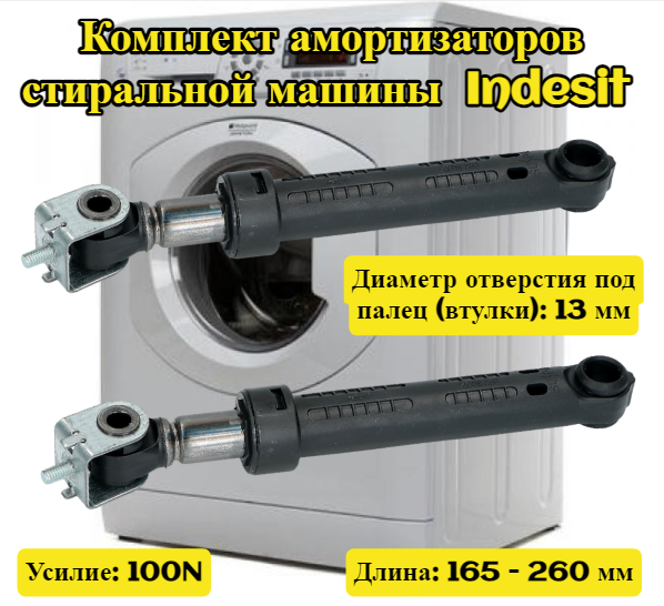 C00140744, C0097259 Амортизаторы стиральной машины (комплект 2шт) Indesit 100N длинна 165-260мм диаметр втулки 13мм крепление под болт M5 140744, 097259 интересное: