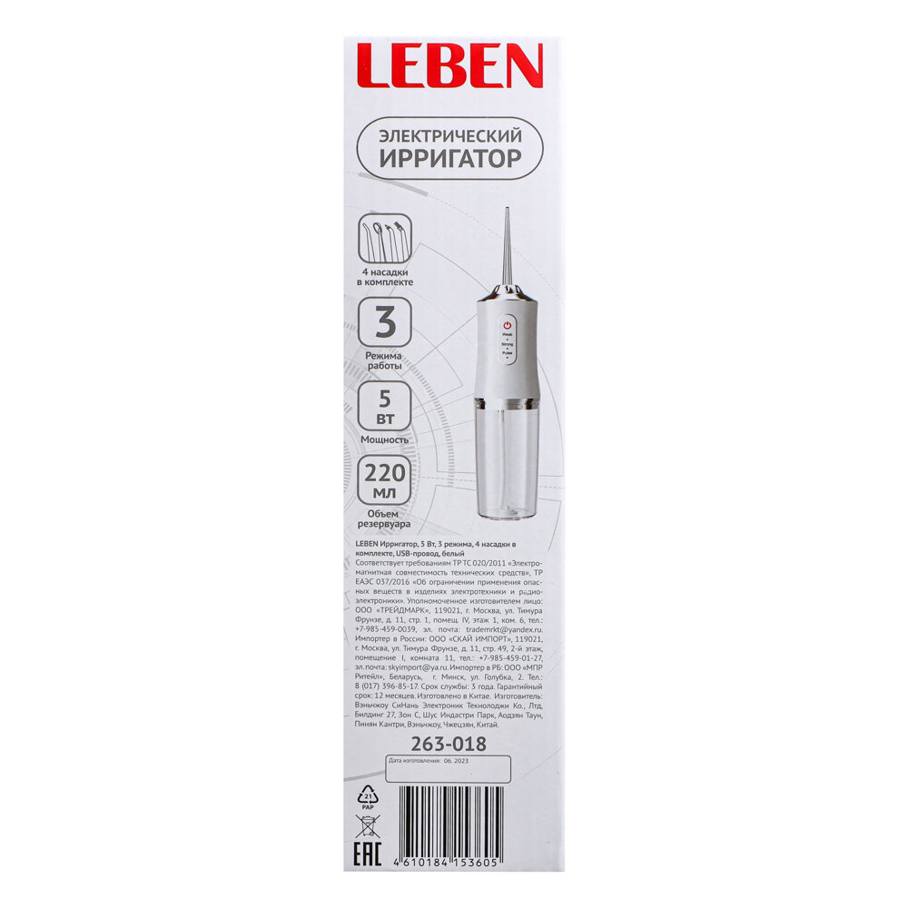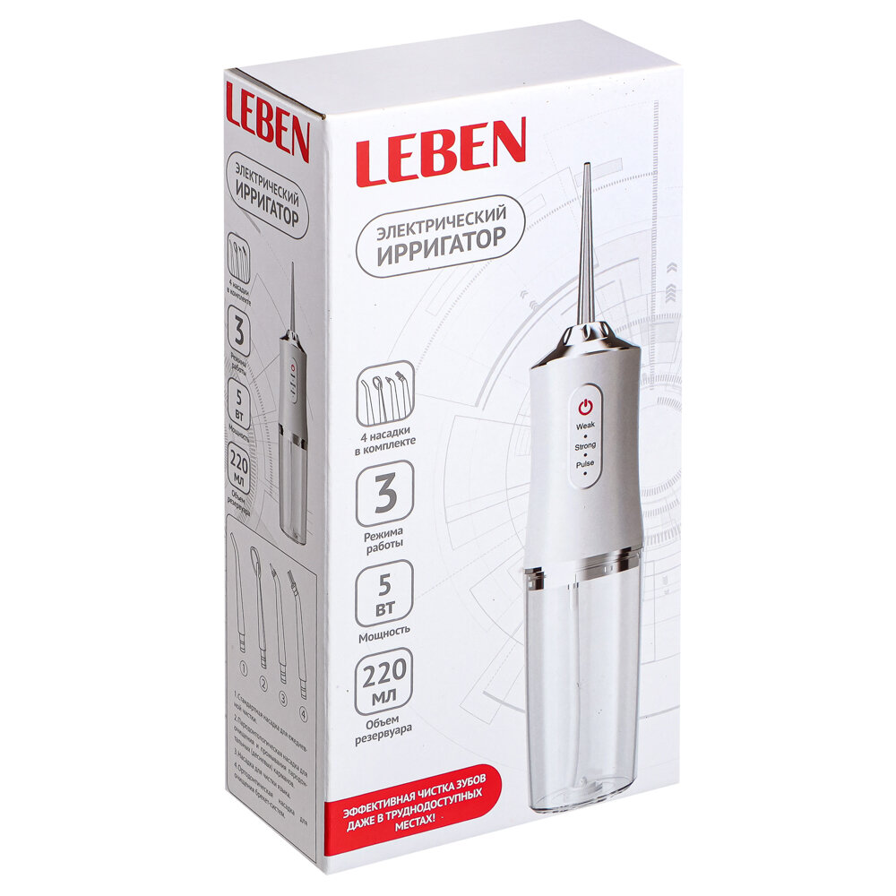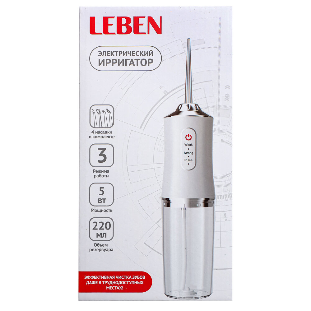 Купить LEBEN Ирригатор, 5 Вт, 3 режима, 4 насадки в комплекте, USB-провод, белый