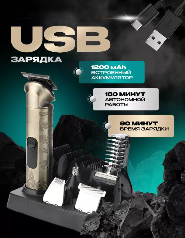 | В комплекте | бритвенный станок / защитный колпачок / кабель USB / крышка для сменного ножа / масло / насадка для бороды / насадка для стрижки волос в носу / насадка для ушей / сумка для хранения / щеточка |