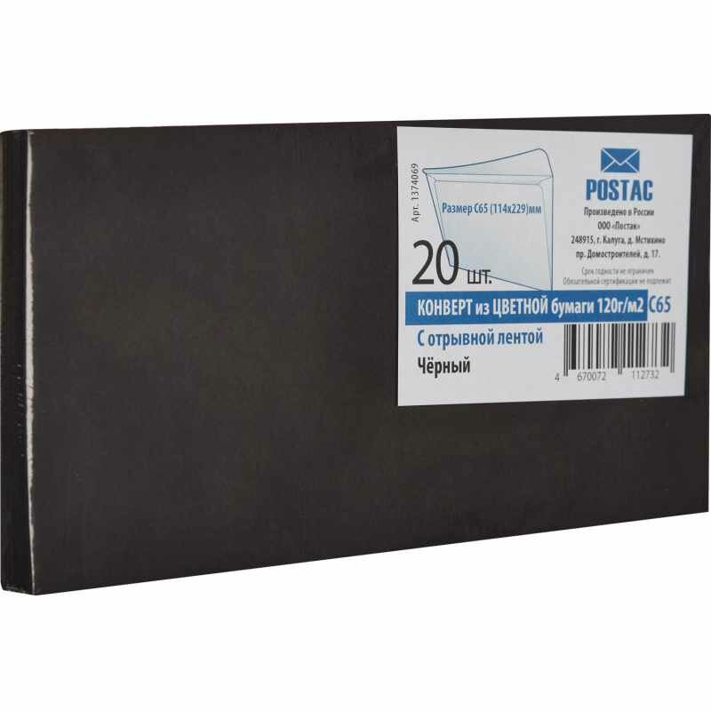Конверт С65 из цв. бум,120г/м2 с отрыв. лентой , черный,20 шт./уп