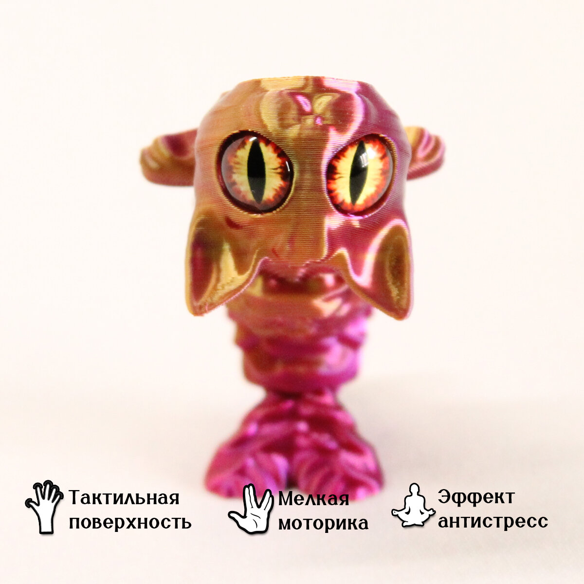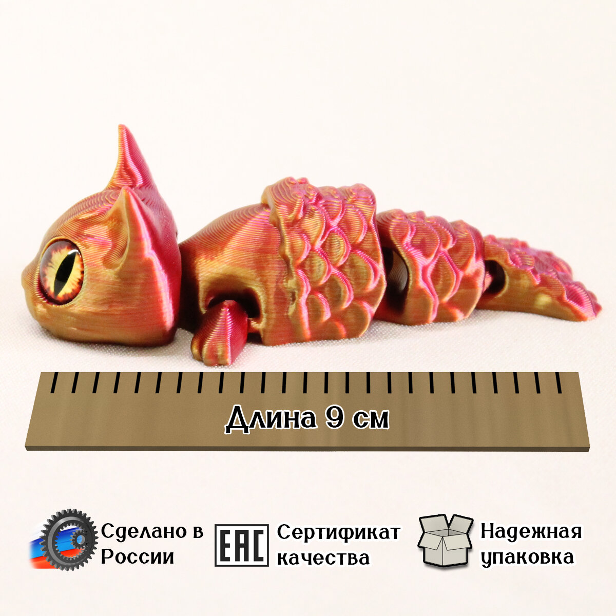 | Дополнительная информация | Игрушка изготовлена методом 3д печати, доработана вручную. Материал изготовления игрушки - PLA. Материал изготовления глазок - стекло. |