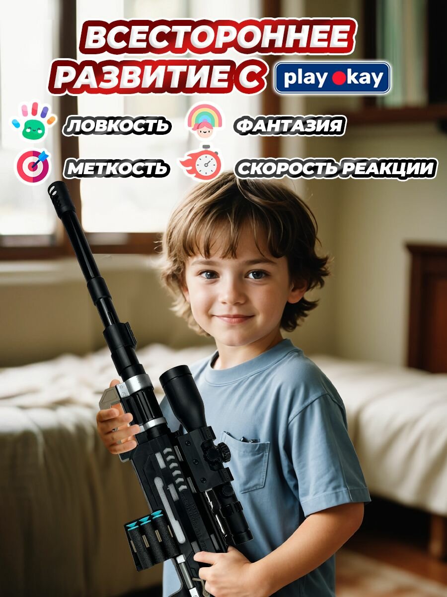 Винтовка снайперская детская Play Okay мягкие пули и пули-шарики, abs-пластик, батарейка (не входит в комплект), черный интересное: