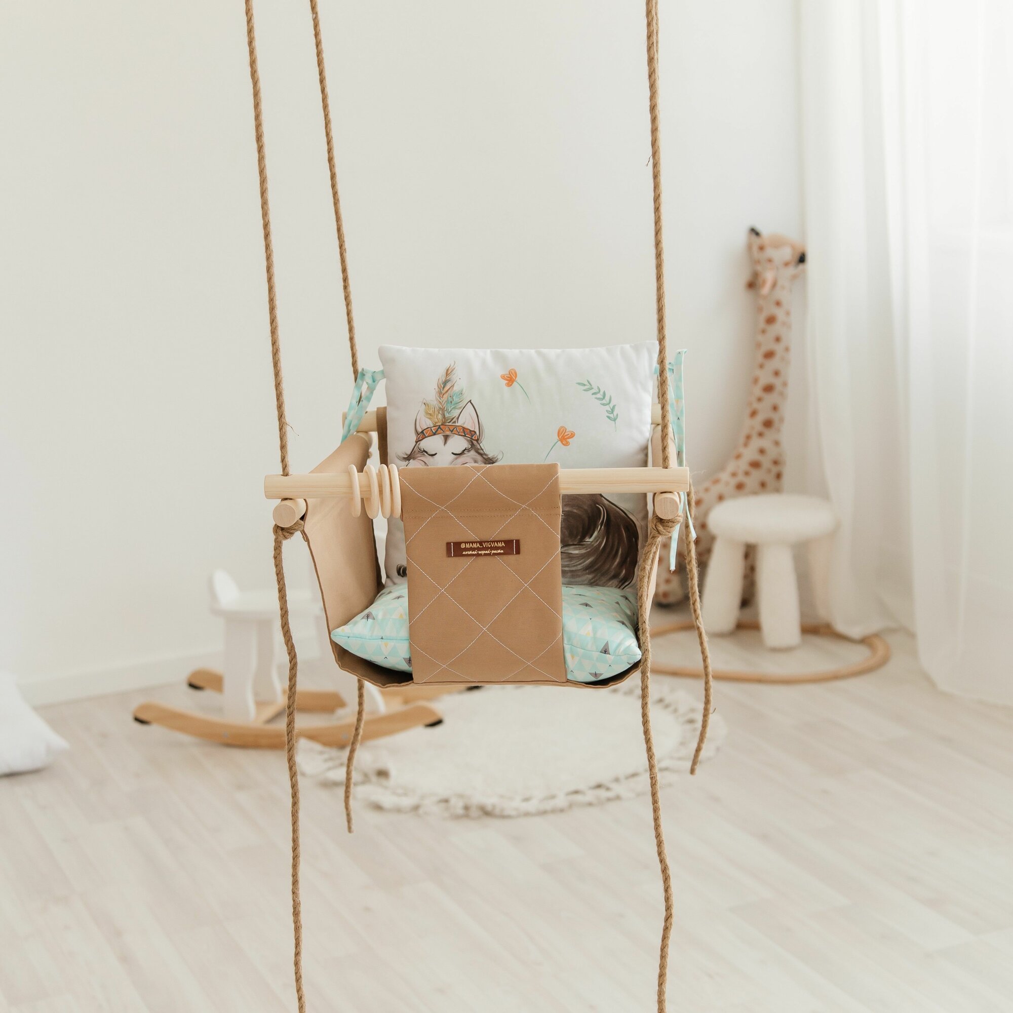 Качели подвесные детские тканевые с ремнем безопасности для дома и дачи "Лесные жители" подушка Лисичка с 6 месяцев