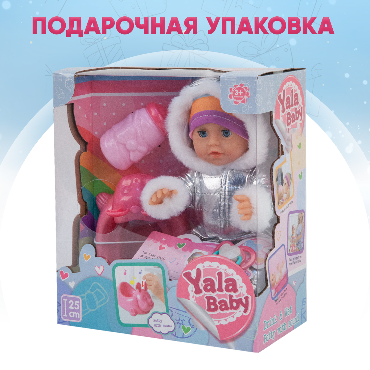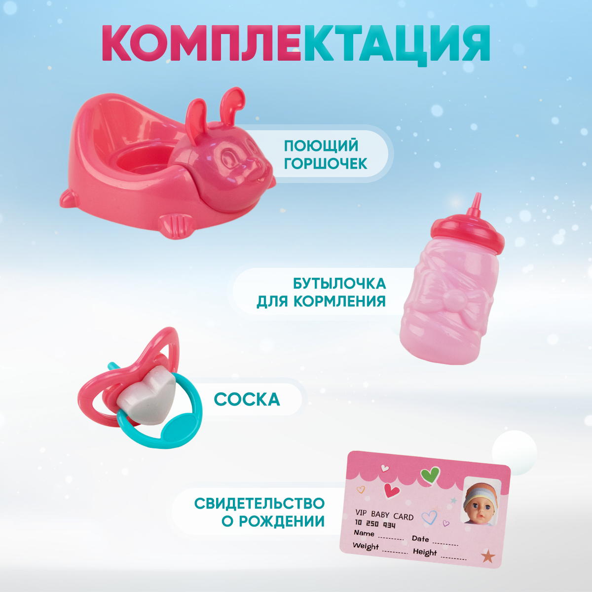 | Комплектация | Кукла-Пупс, горшочек, градусник, шприц, отоскоп, ложечка, ножницы, зажим, соска, бутылочка, свидетельство о рождении |