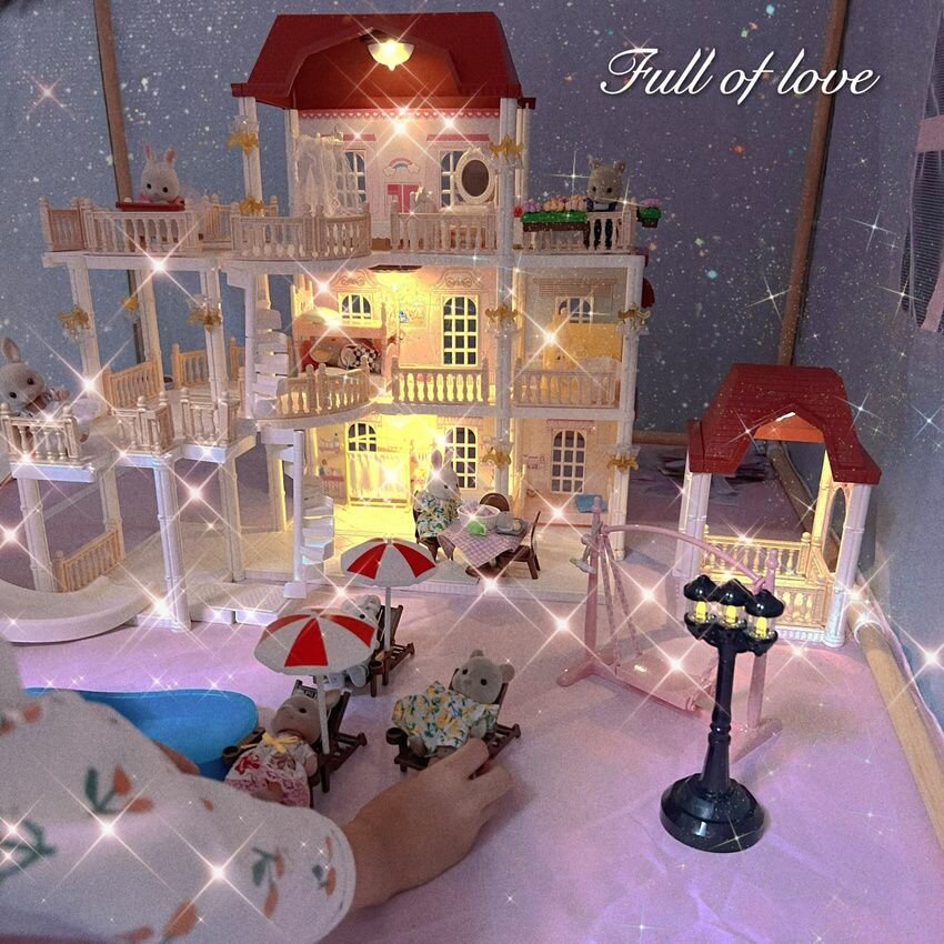 Купить Трёхэтажный кукольный домик с мебелью, балконами, террасой и милыми зверушками, новогодний подарочный детский игровой набор
