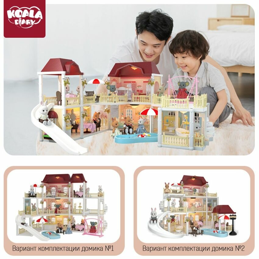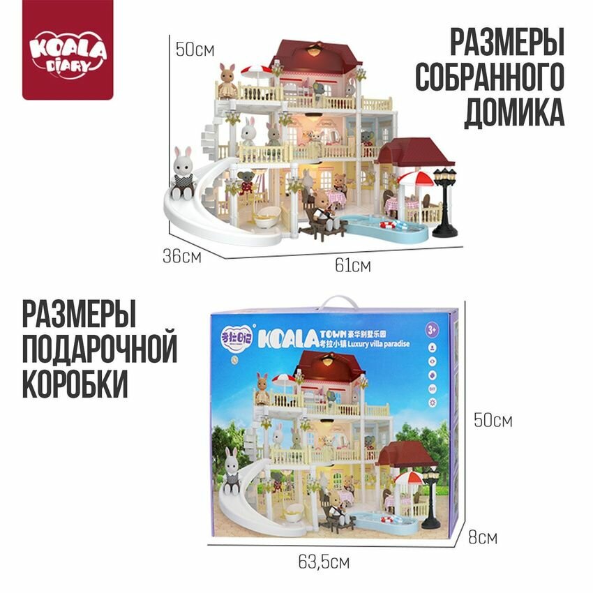 Трёхэтажный кукольный домик с мебелью, балконами, террасой и милыми зверушками, новогодний подарочный детский игровой набор интересное: