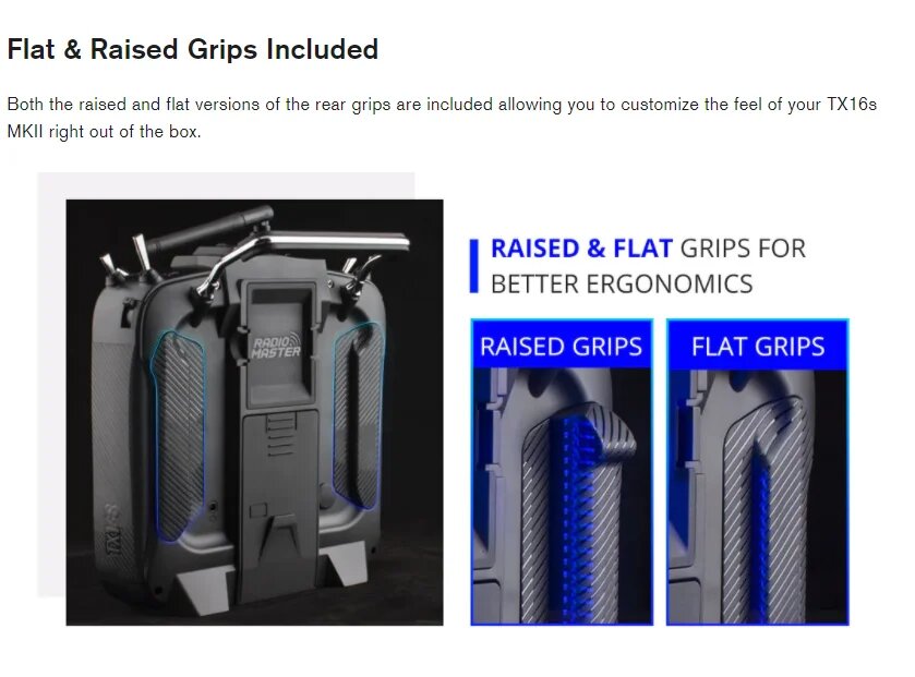 | Комплектация | Пульт управления RadioMaster TX16S MKII с ручками управления на датчиках Холла V4.0 и с встроенным модулем 4-в-11. Лоток под аккумулятор 18650. Кабель USB-C. Защитная пленка для экрана. Пара плоских накладок. Пара поднятых накладок (по умолчанию установлены на пульт). Брелок TX16S для ключей. |