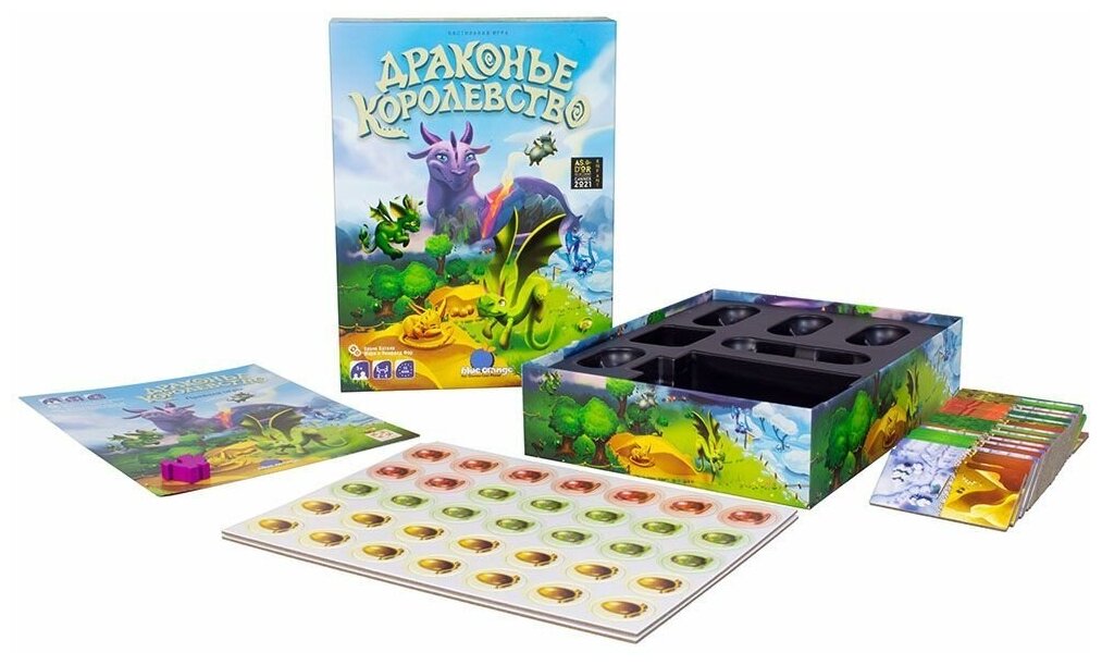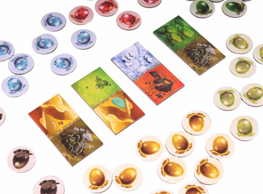 | Комплектация | В состав настольной игры входят: 4 стартовых тайла; 1 фишка мамы-дракона; 28 тайлов исследования; 69 жетонов яиц: 14 яиц, которые можно найти в пустынном ландшафте; 13 яиц, которые можно найти в заснеженном ландшафте; 12 яиц, которые можно найти в степном ландшафте; 11 яиц, которые можно найти в лесном ландшафте; 10 яиц, которые можно найти в горном ландшафте; 9 яиц, которые можно найти в вулканическом ландшафте, правила игры. |