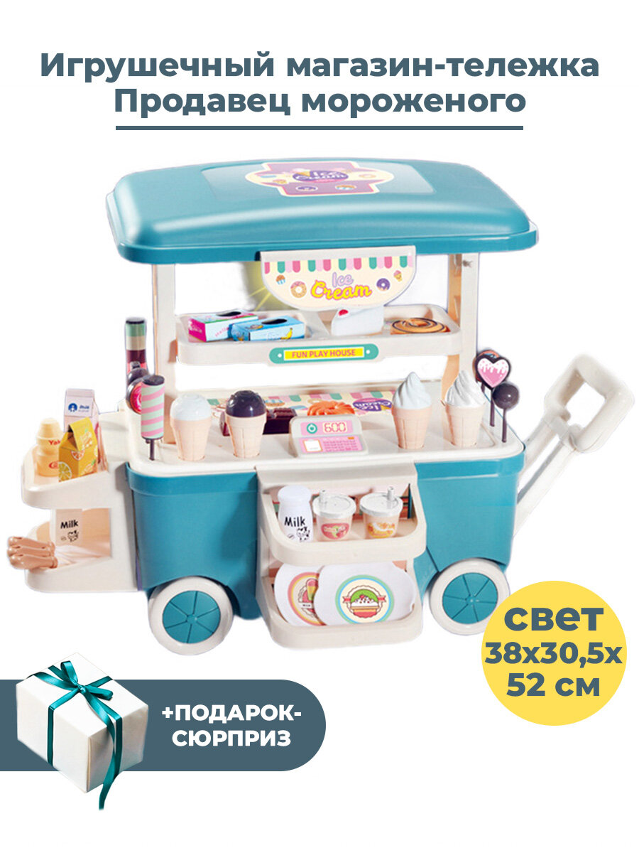 Игрушечный магазин тележка Продавец мороженого + Подарок бирюзовый 38х30,5х52 см интересное: