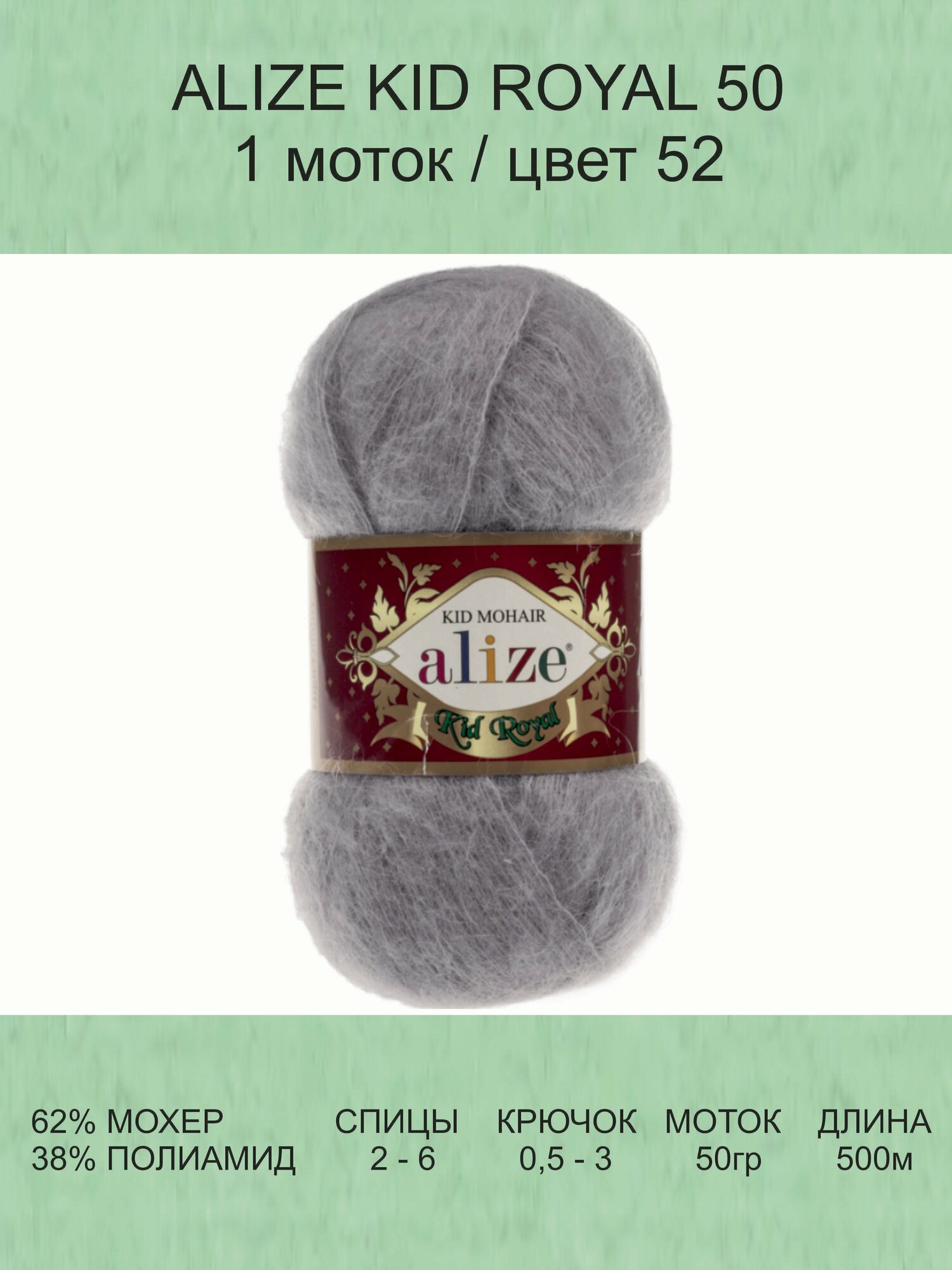 Купить Пряжа Alize Kid Royal 50 серый (52), 62%кид мохер/38%полиамид, 500м, 50г, 1шт