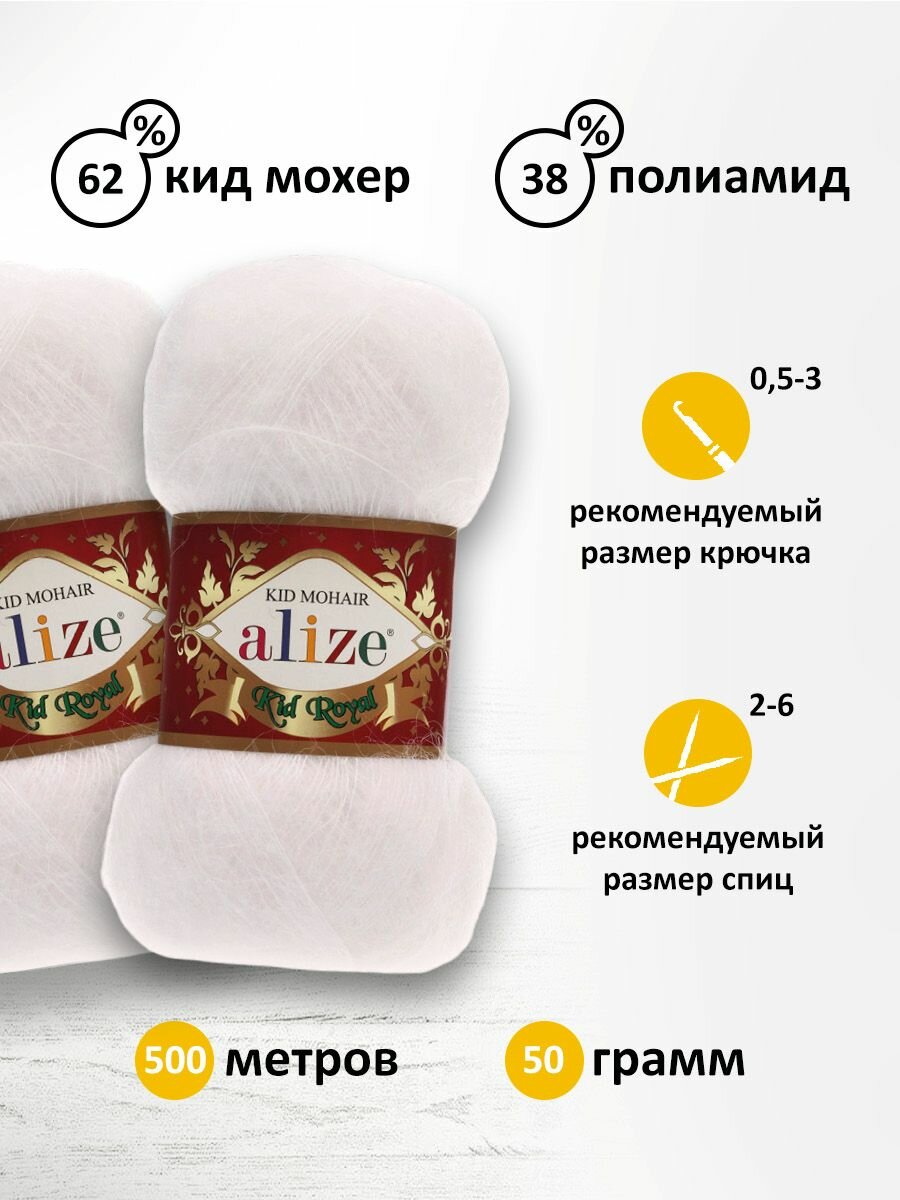 Пряжа Alize Kid Royal 50 белый (55), 62%кид мохер/38%полиамид, 500м, 50г, 2шт