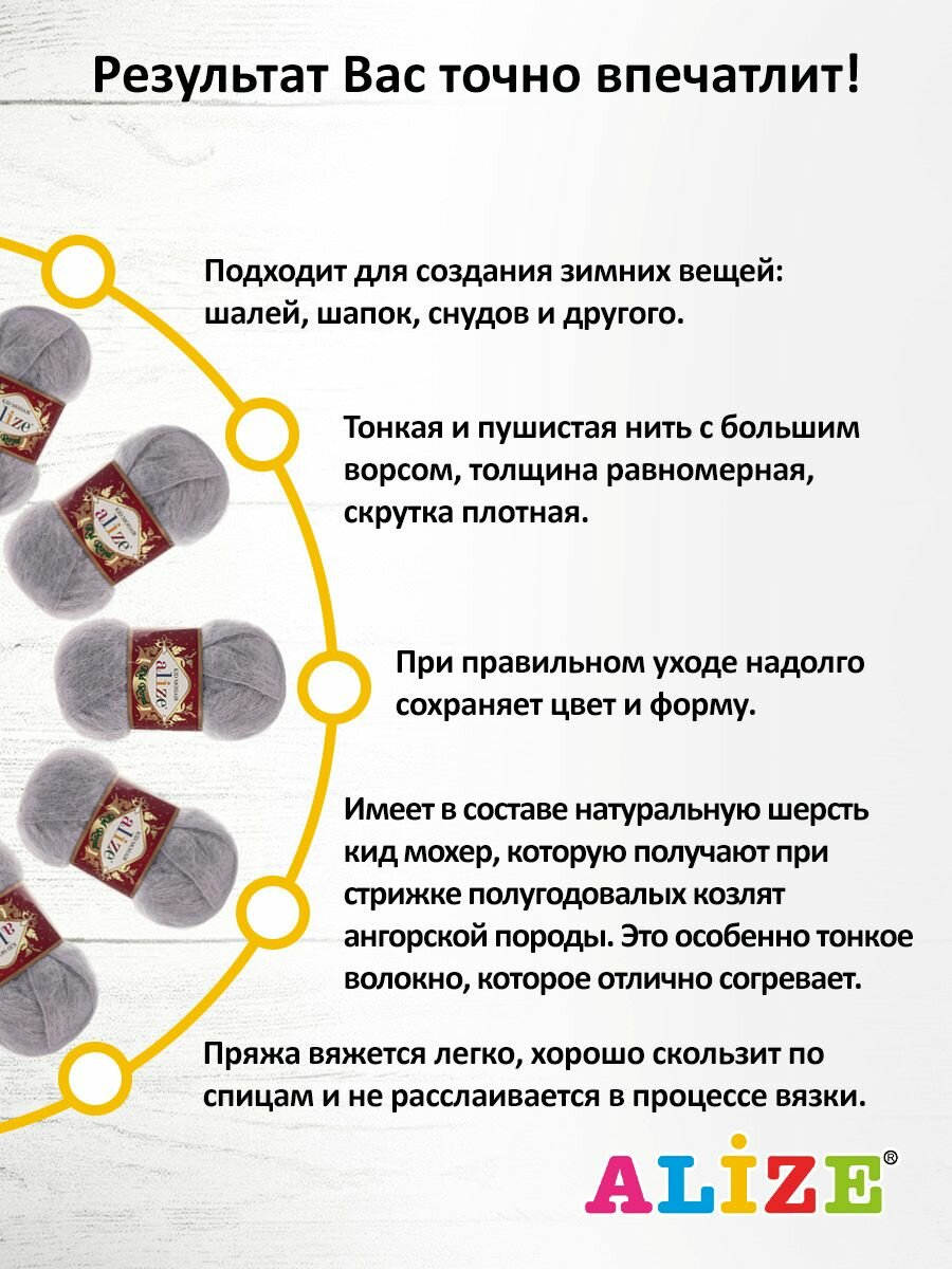 СохранитьПряжа для вязания Alize 'Kid royal', 50г, 500м (62% кид мохер, 38% полиамид), ТУ (52 талая вода), 5 мотков интересное: