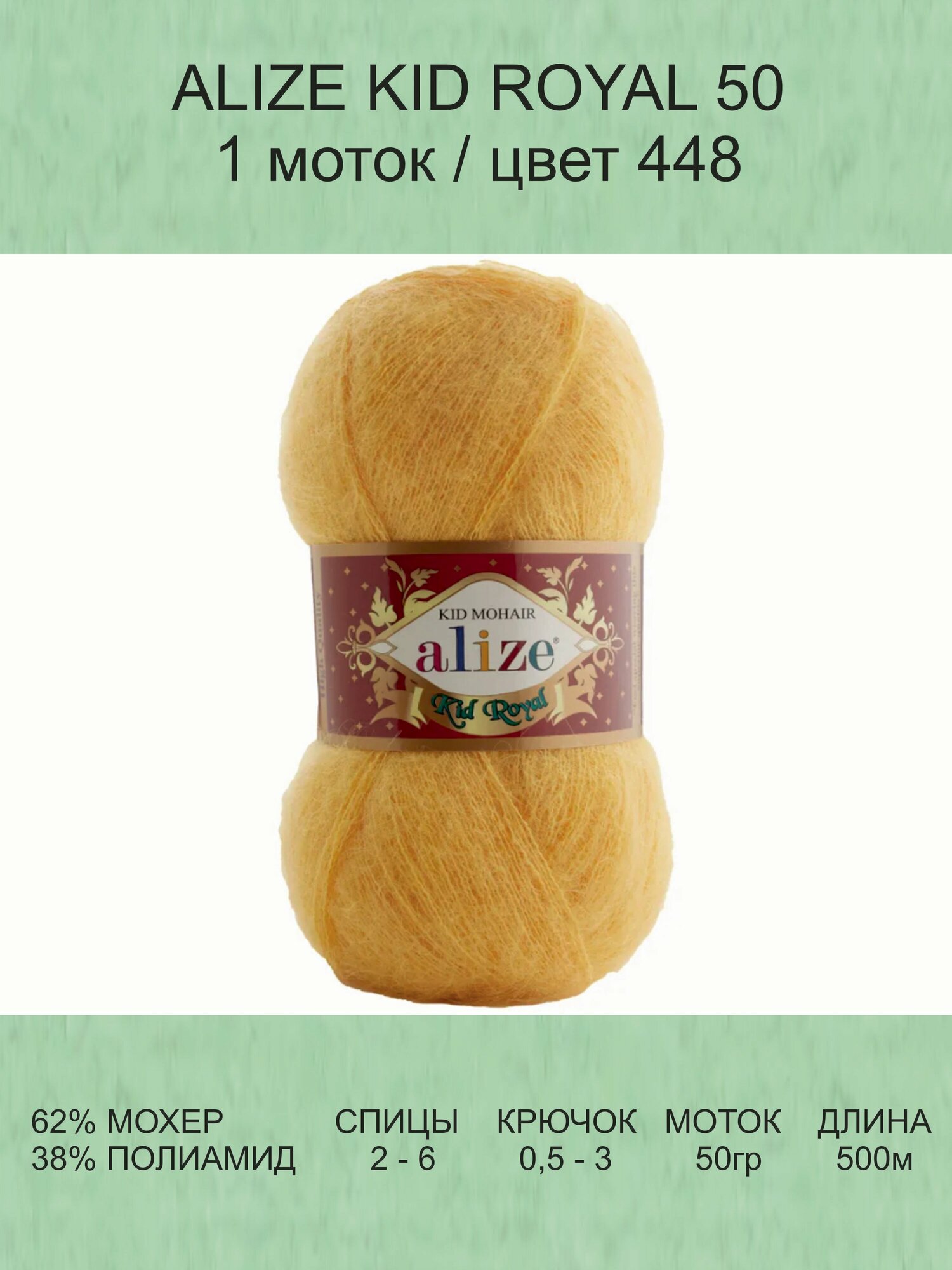 Купить Пряжа Alize Kid Royal 50 желтый (488), 62%кид мохер/38%полиамид, 500м, 50г, 1шт
